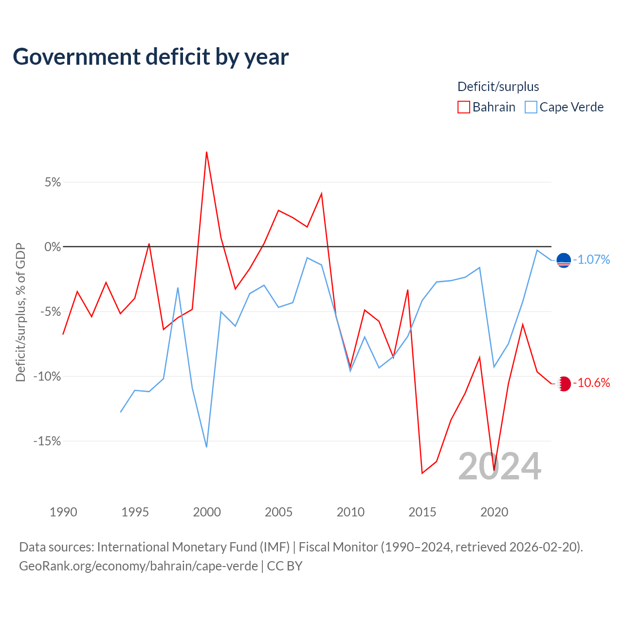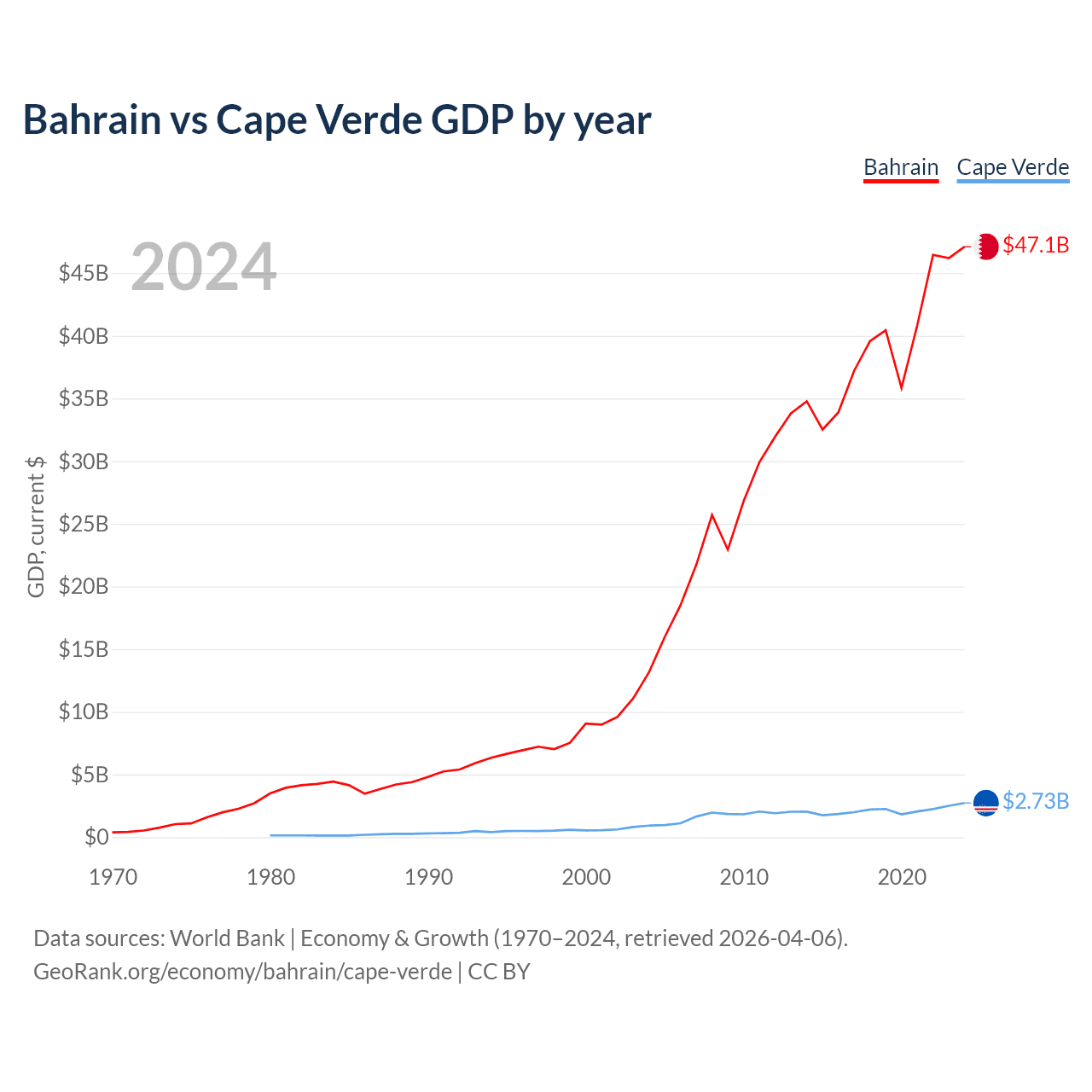 Bahrain has a GDP of $47.1B compared to $2.73B for Cape Verde, ranking 96/197 and 172/197 by economy size, respectively.