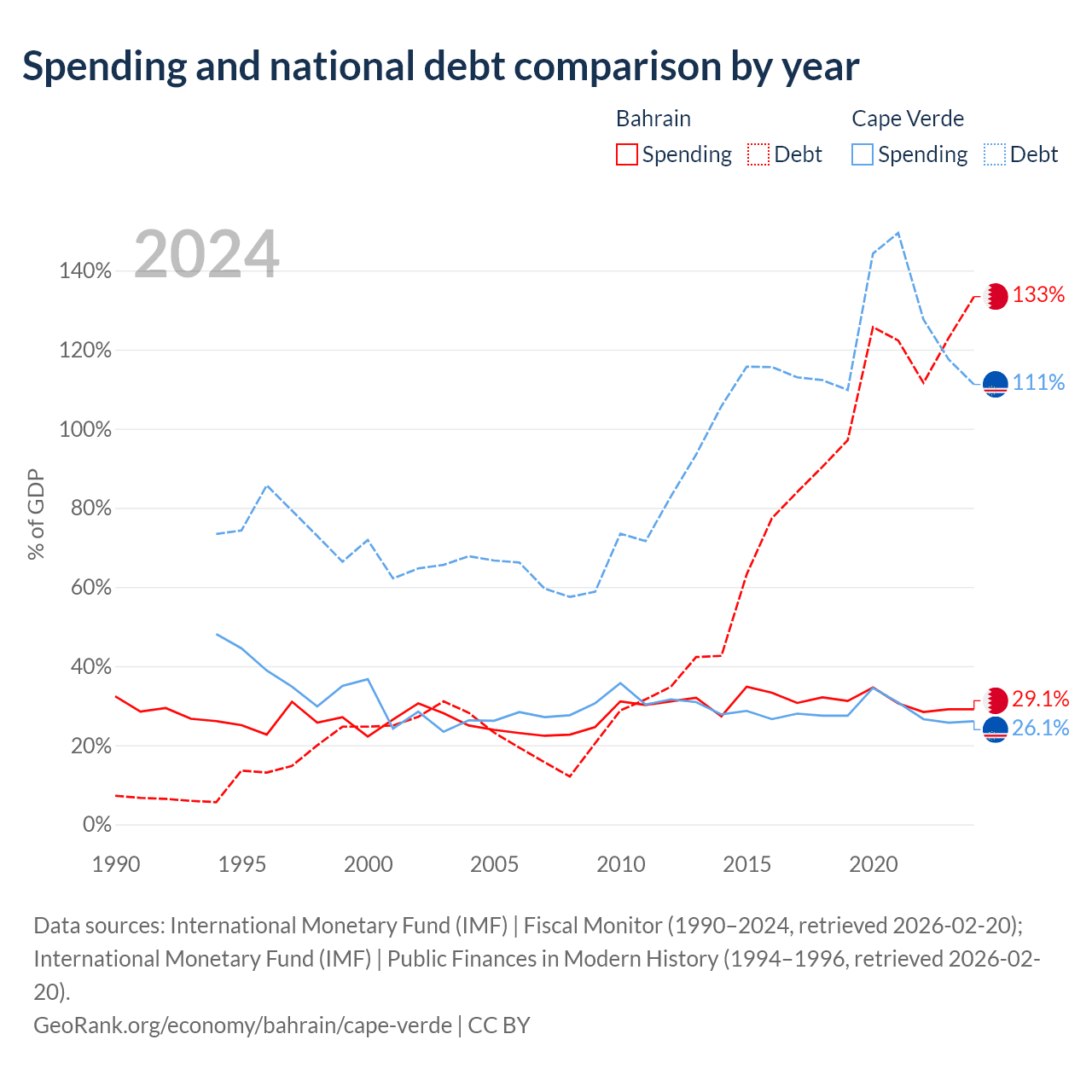 Bahrain has $62.8B in government debt (133.4% of GDP), compared to $3.03B (111.2% of GDP) in Cape Verde.