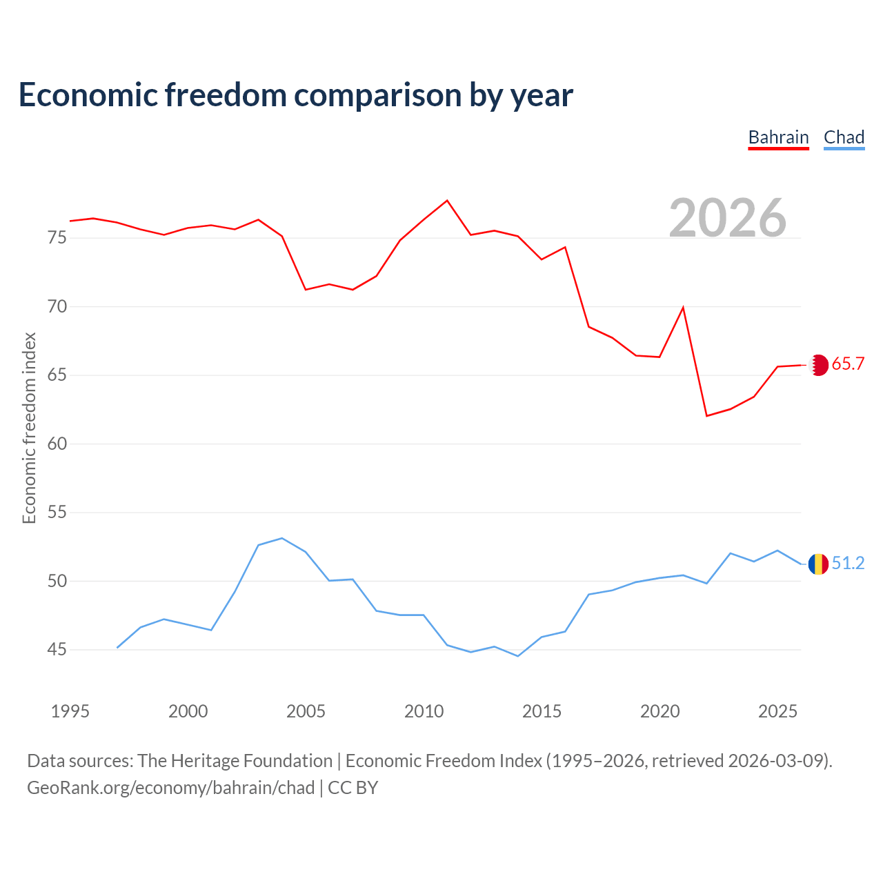 The Economic Freedom Index for Bahrain is 65.7, ranking 63/197, compared to 51.2 for Chad, ranking 154/197. The chart above displays a comparison of annual changes in economic freedom indexes.