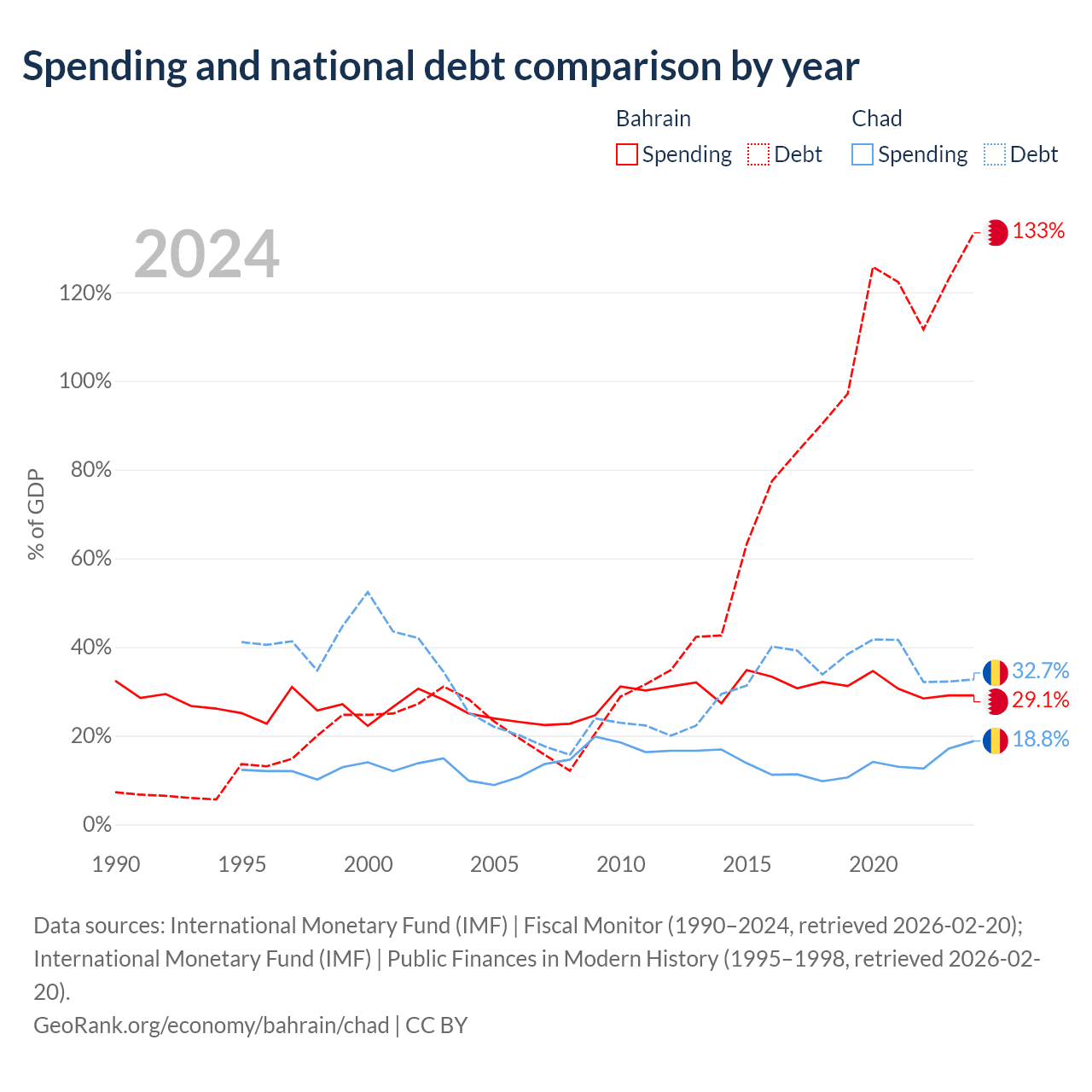 Bahrain has $62.8B in government debt (133.4% of GDP), compared to $6.37B (32.7% of GDP) in Chad.