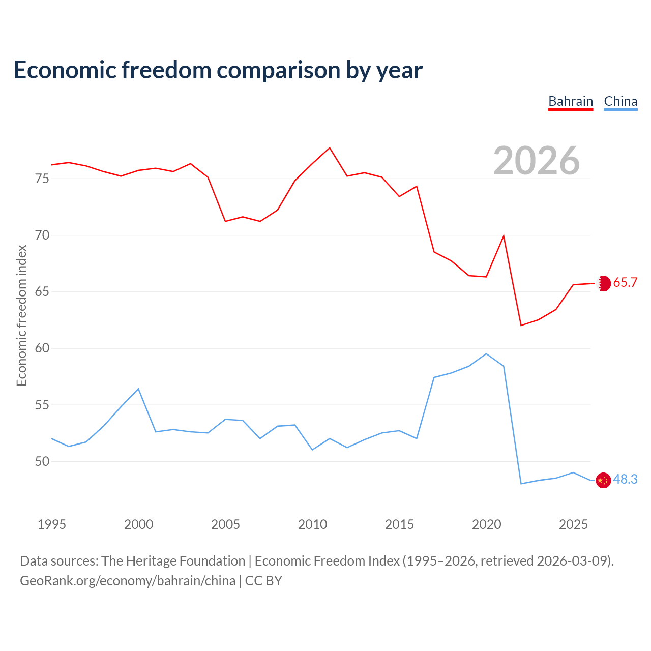 The Economic Freedom Index for Bahrain is 65.7, ranking 63/197, compared to 48.3 for China, ranking 170/197. The chart above displays a comparison of annual changes in economic freedom indexes.