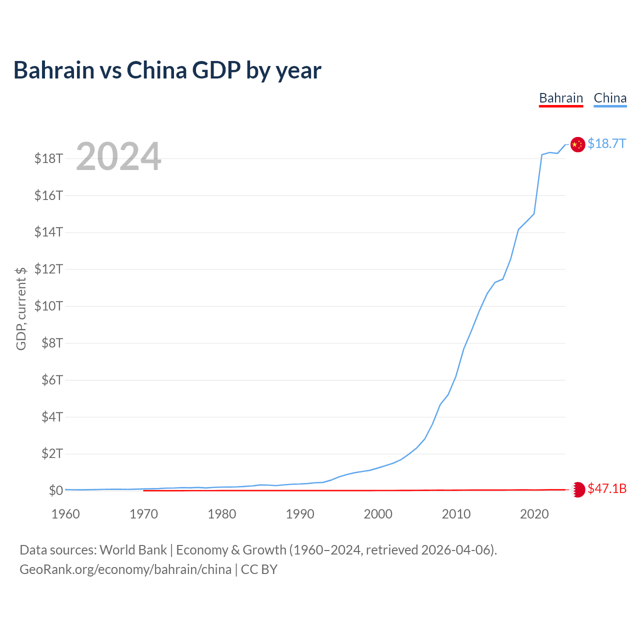 Bahrain has a GDP of $47.1B compared to $18.7T for China, ranking 96/197 and 2/197 by economy size, respectively.