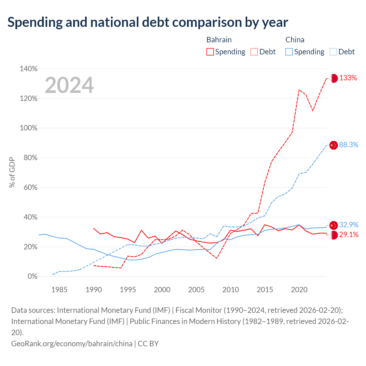 Bahrain has $62.8B in government debt (133.4% of GDP), compared to $16.6T (88.3% of GDP) in China.