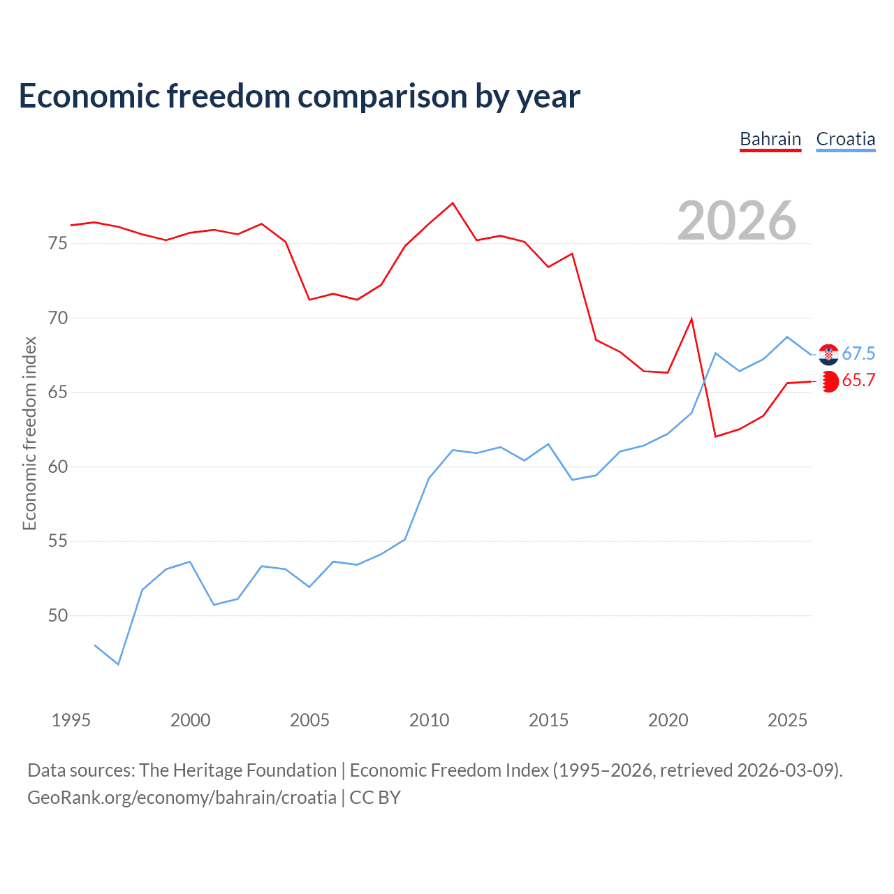 The Economic Freedom Index for Bahrain is 65.7, ranking 63/197, compared to 67.5 for Croatia, ranking 56/197. The chart above displays a comparison of annual changes in economic freedom indexes.