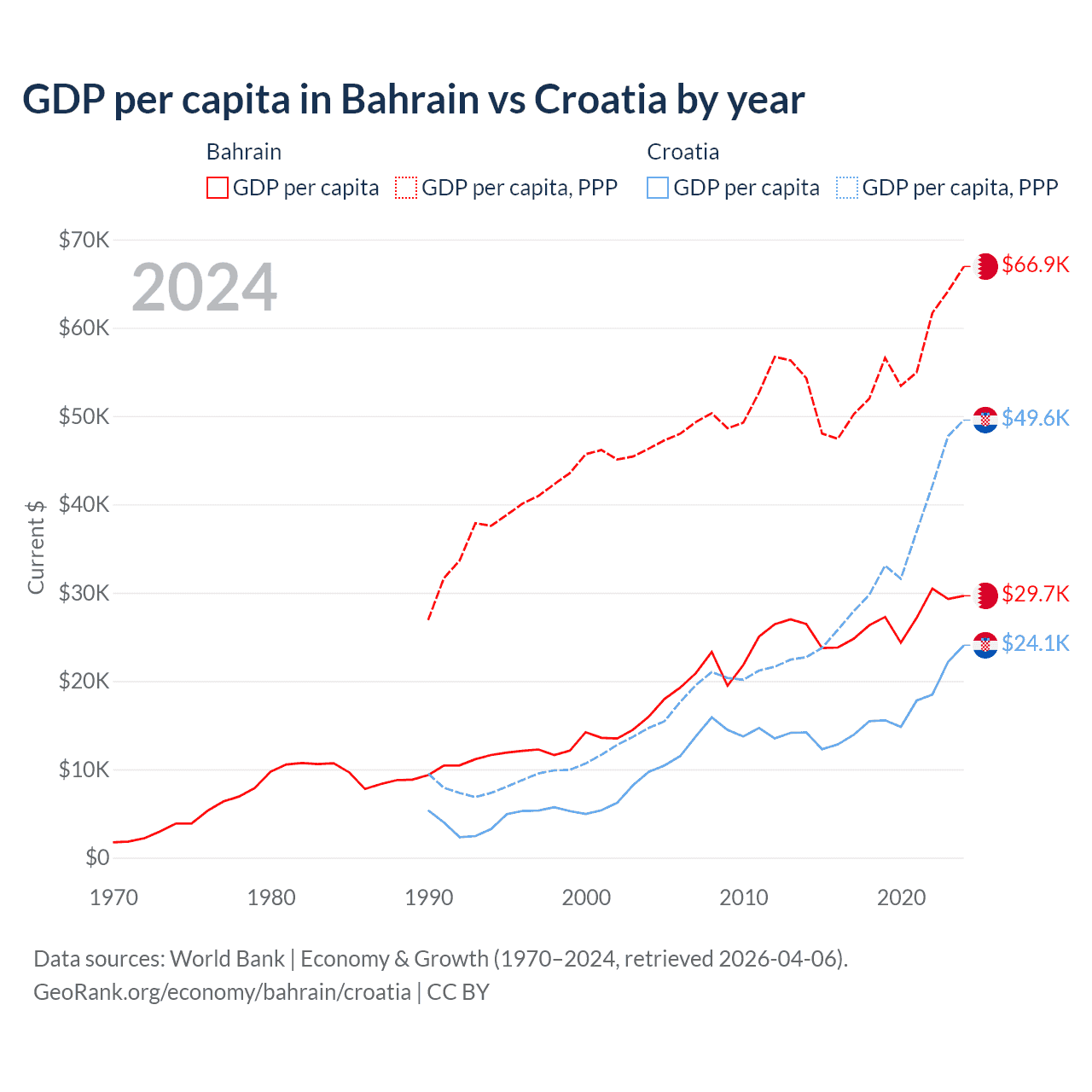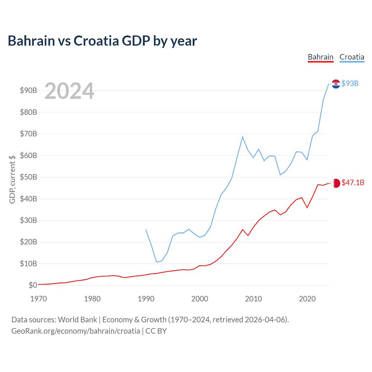 Bahrain has a GDP of $47.1B compared to $93B for Croatia, ranking 96/197 and 75/197 by economy size, respectively.