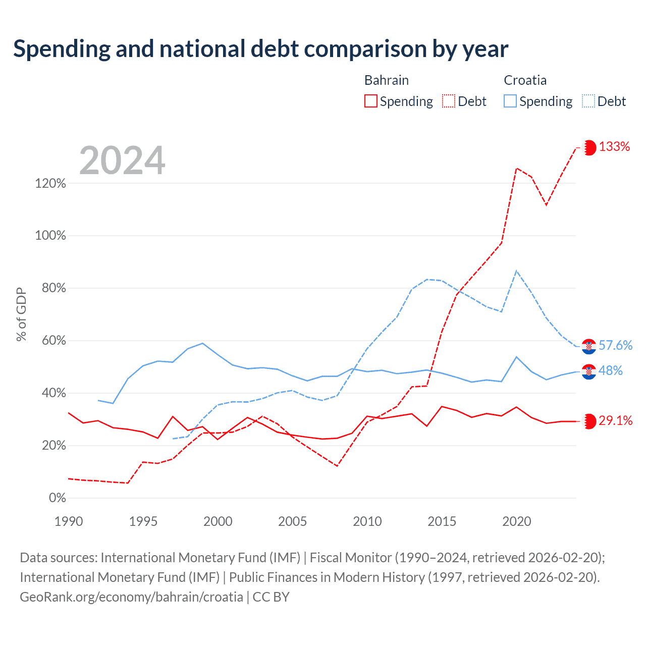 Bahrain has $62.8B in government debt (133.4% of GDP), compared to $53.5B (57.6% of GDP) in Croatia.