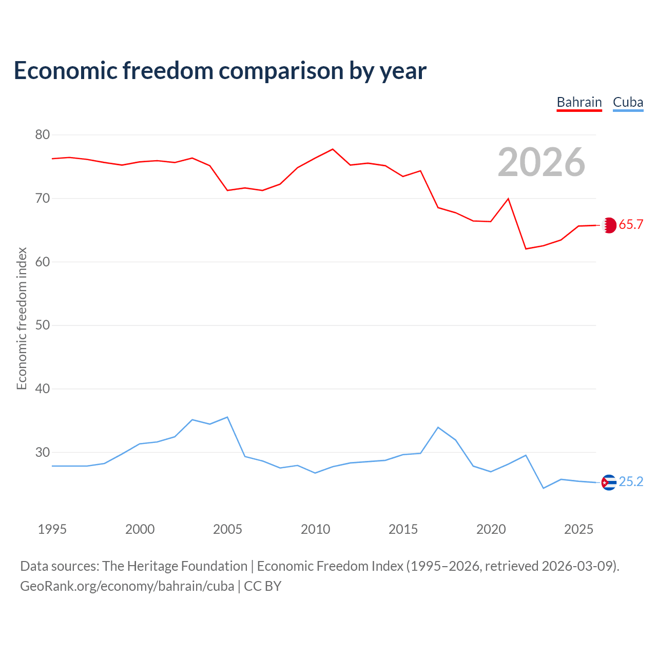The Economic Freedom Index for Bahrain is 65.7, ranking 63/197, compared to 25.2 for Cuba, ranking 195/197. The chart above displays a comparison of annual changes in economic freedom indexes.
