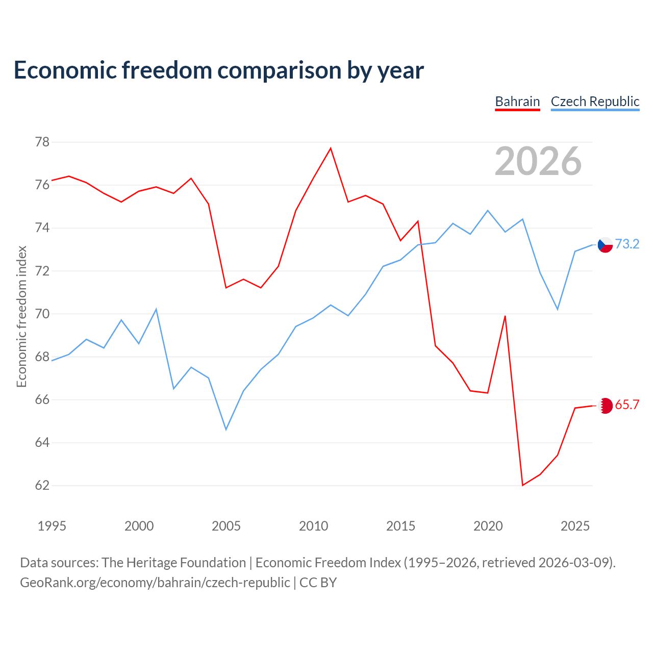 The Economic Freedom Index for Bahrain is 65.7, ranking 63/197, compared to 73.2 for the Czech Republic, ranking 25/197. The chart above displays a comparison of annual changes in economic freedom indexes.
