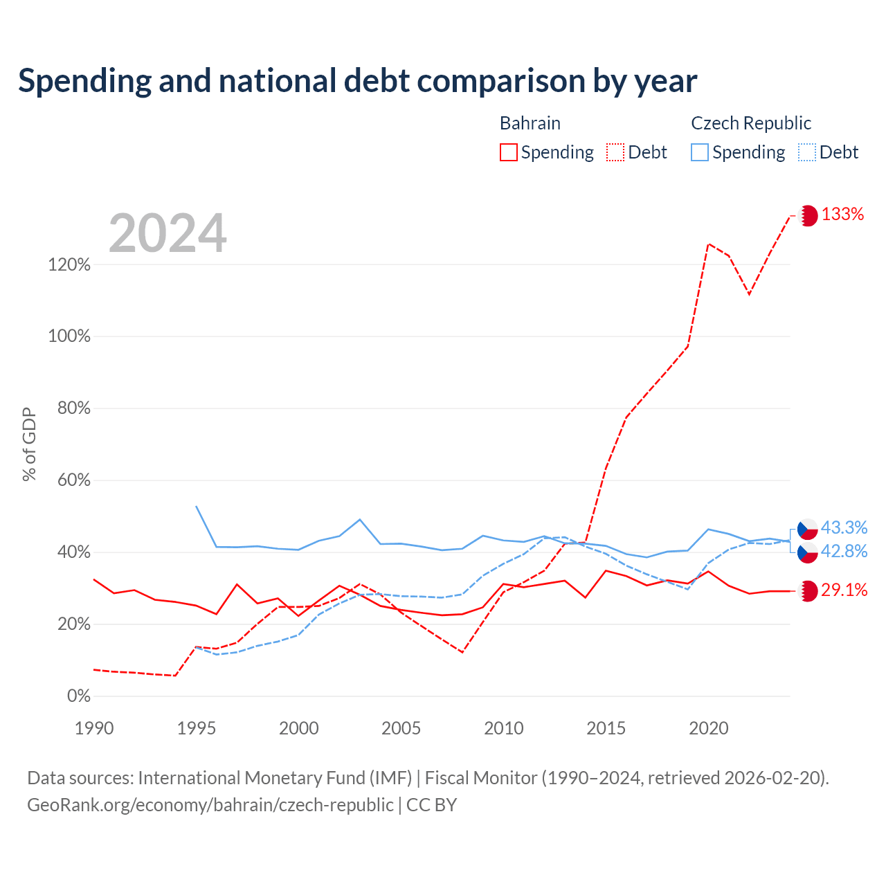 Bahrain has $62.8B in government debt (133.4% of GDP), compared to $150B (43.3% of GDP) in the Czech Republic.