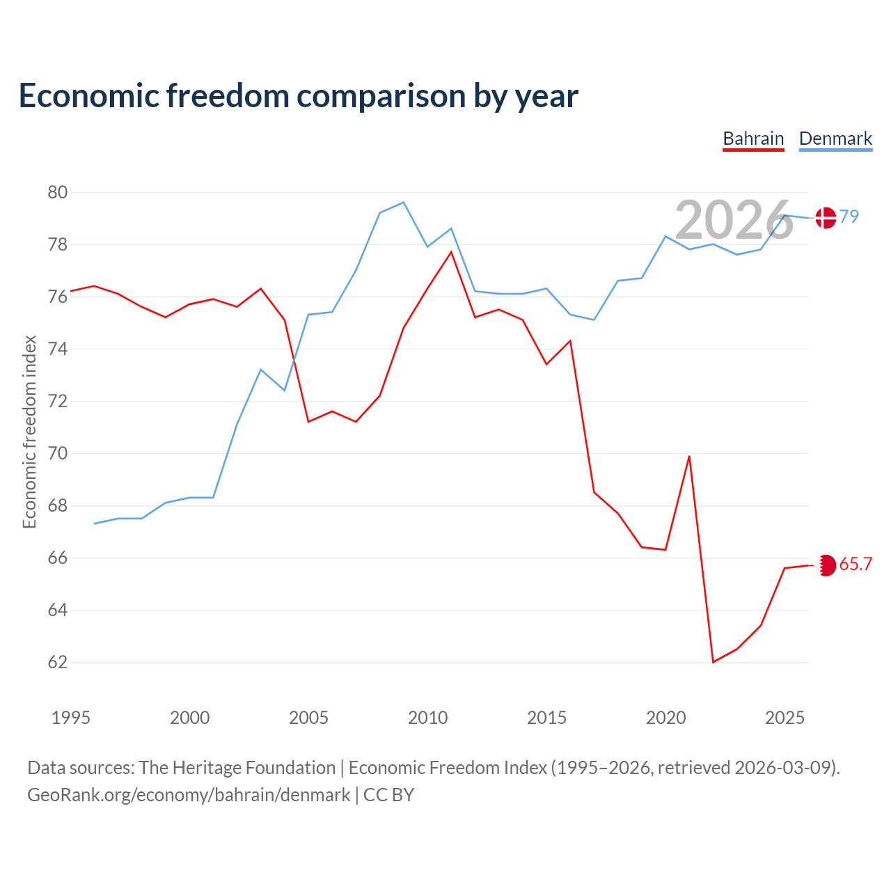 The Economic Freedom Index for Bahrain is 65.7, ranking 63/197, compared to 79 for Denmark, ranking 8/197. The chart above displays a comparison of annual changes in economic freedom indexes.