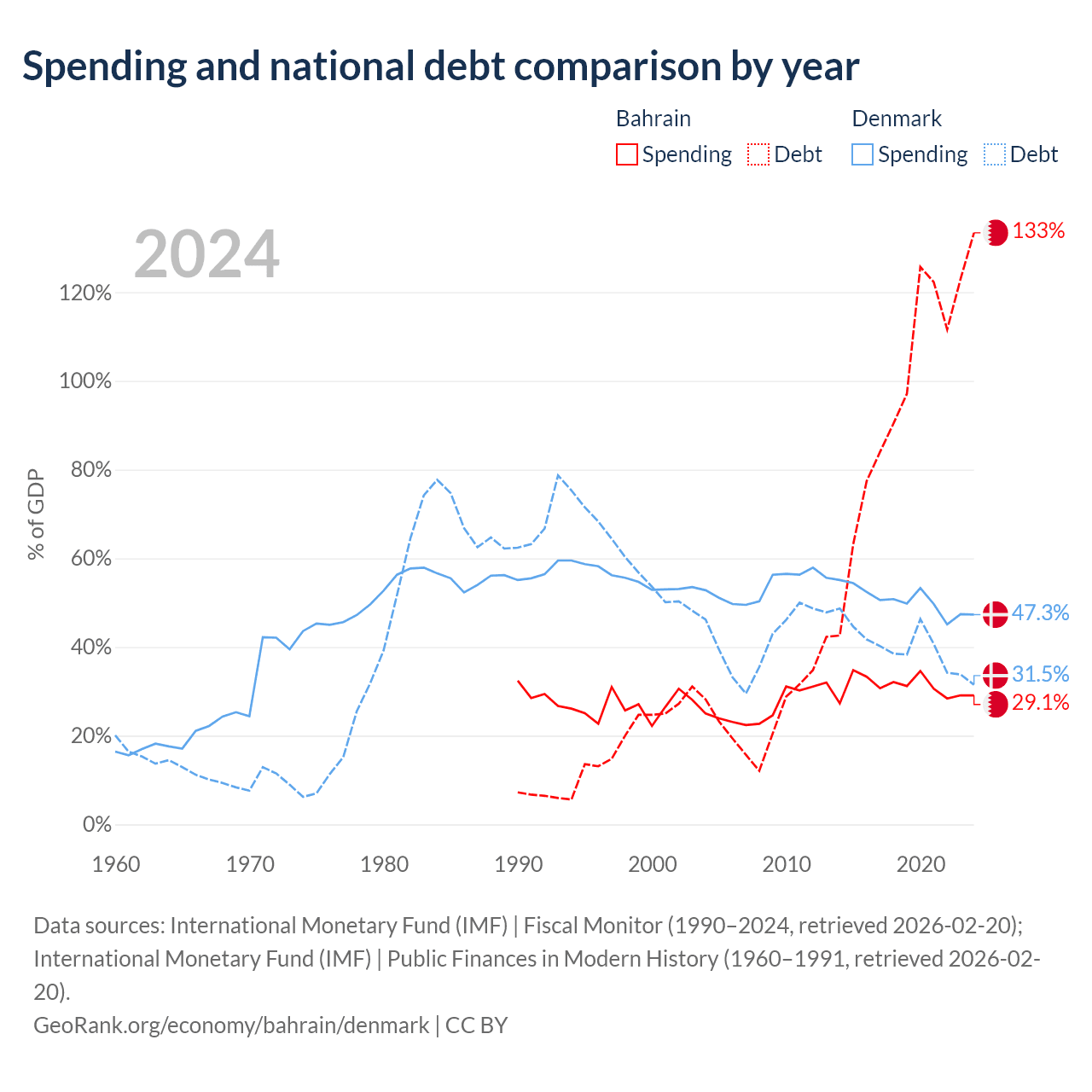 Bahrain has $62.8B in government debt (133.4% of GDP), compared to $134B (31.5% of GDP) in Denmark.