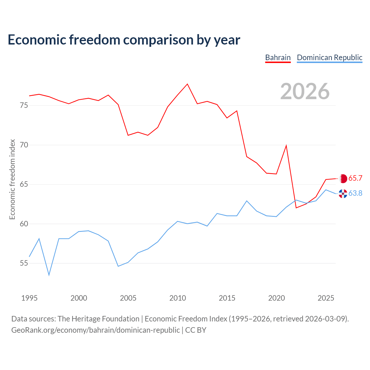 The Economic Freedom Index for Bahrain is 65.7, ranking 63/197, compared to 63.8 for the Dominican Republic, ranking 77/197. The chart above displays a comparison of annual changes in economic freedom indexes.