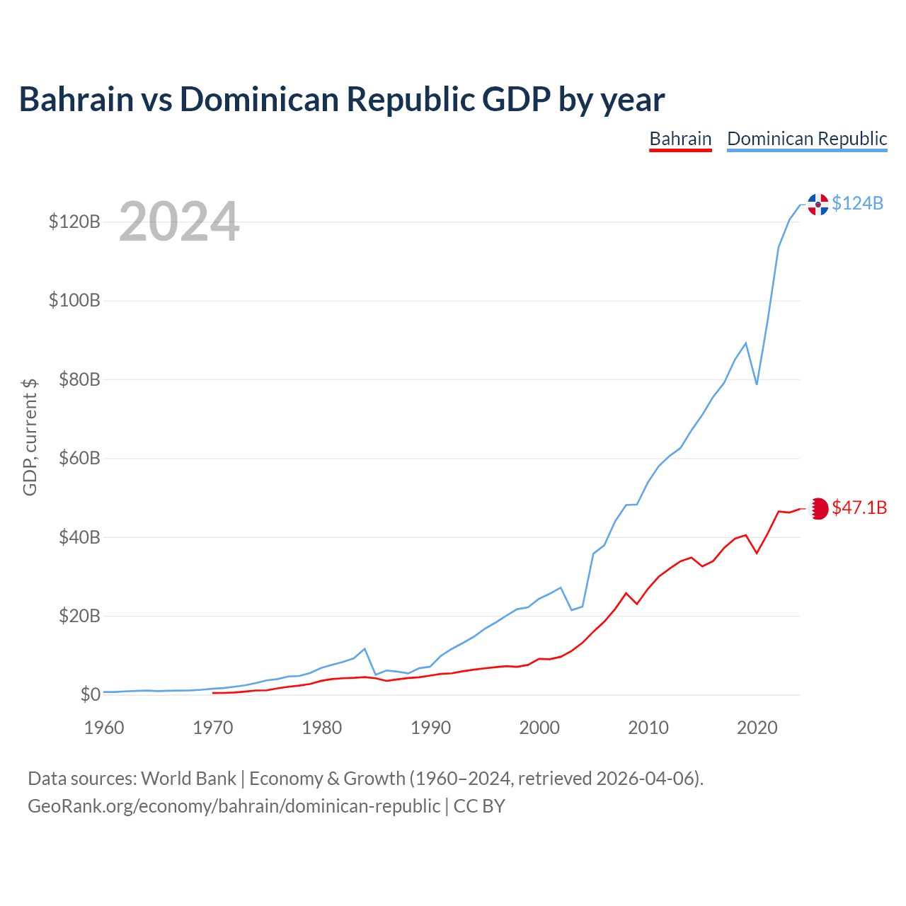 Bahrain has a GDP of $47.1B compared to $124B for the Dominican Republic, ranking 96/197 and 63/197 by economy size, respectively.