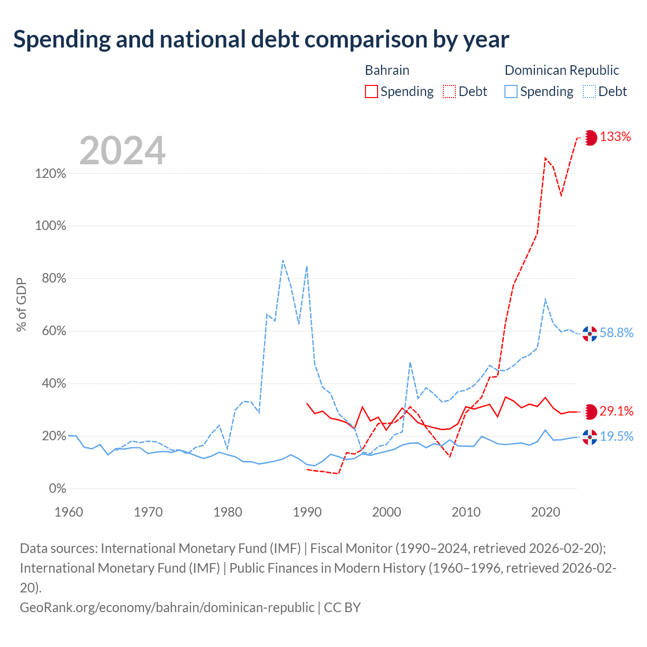 Bahrain has $62.8B in government debt (133.4% of GDP), compared to $73.1B (58.8% of GDP) in the Dominican Republic.