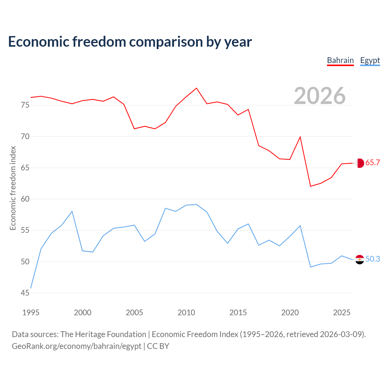 The Economic Freedom Index for Bahrain is 65.7, ranking 63/197, compared to 50.3 for Egypt, ranking 160/197. The chart above displays a comparison of annual changes in economic freedom indexes.
