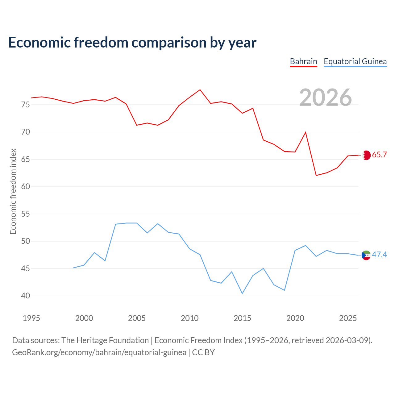 The Economic Freedom Index for Bahrain is 65.7, ranking 63/197, compared to 47.4 for Equatorial Guinea, ranking 175/197. The chart above displays a comparison of annual changes in economic freedom indexes.