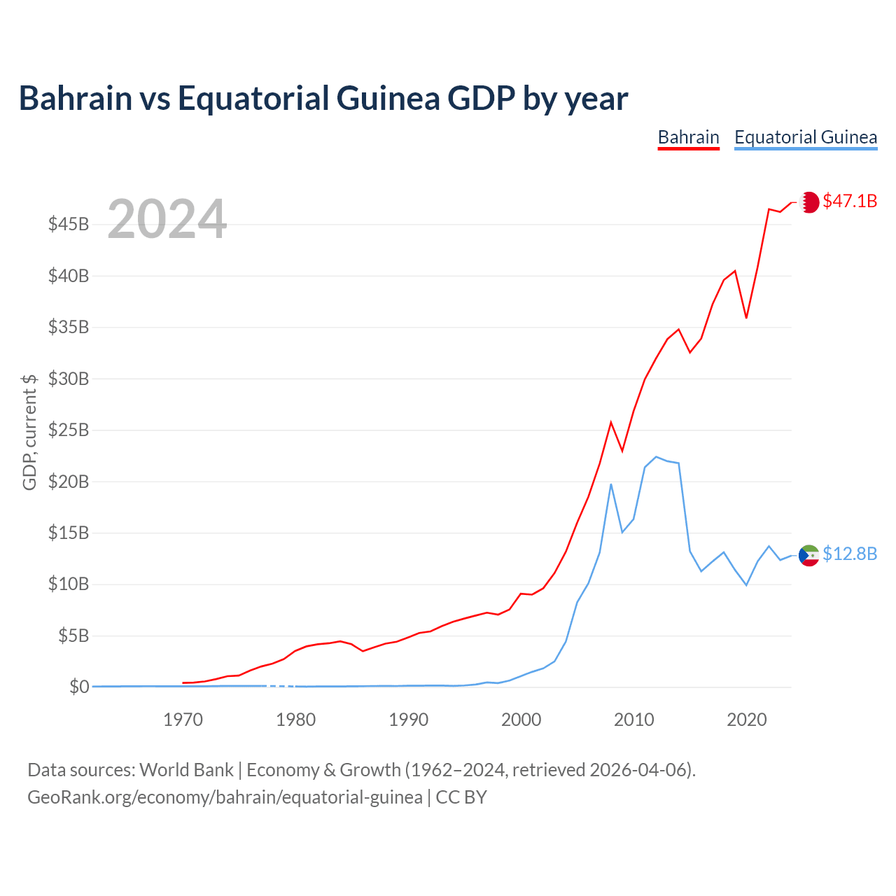Bahrain has a GDP of $47.1B compared to $12.8B for Equatorial Guinea, ranking 96/197 and 148/197 by economy size, respectively.