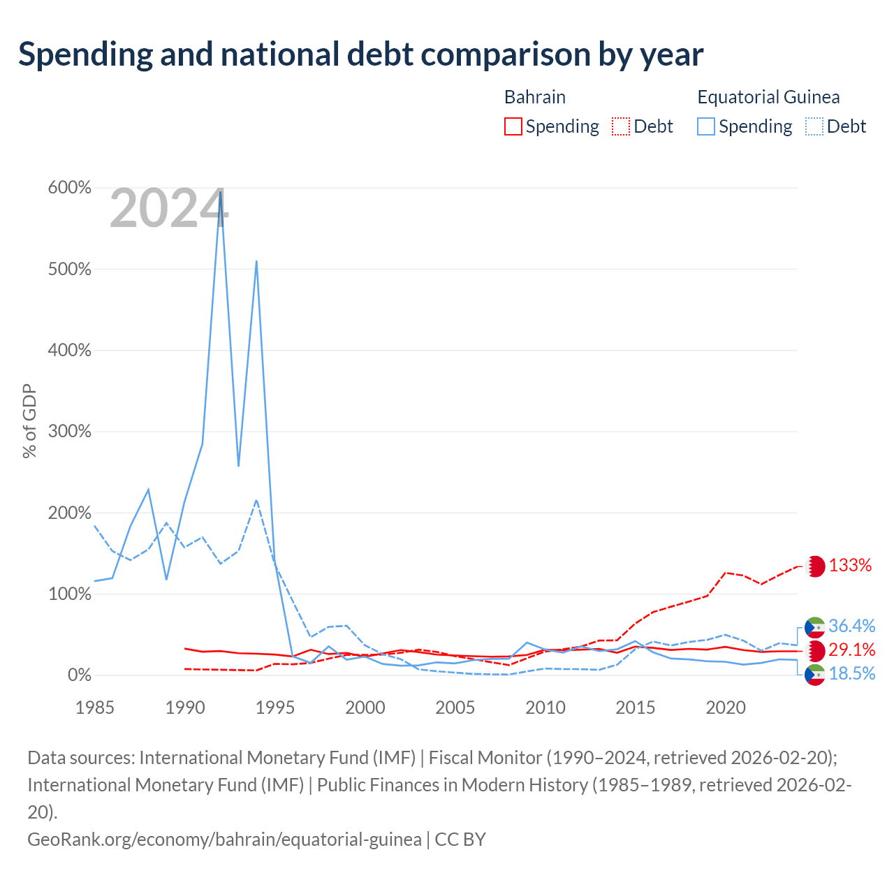 Bahrain has $62.8B in government debt (133.4% of GDP), compared to $4.65B (36.4% of GDP) in Equatorial Guinea.