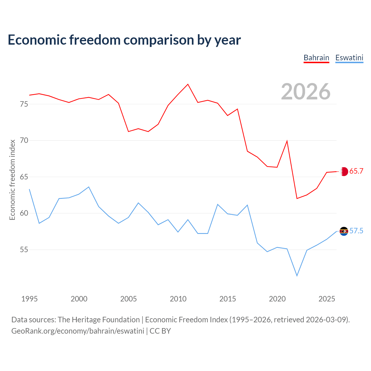 The Economic Freedom Index for Bahrain is 65.7, ranking 63/197, compared to 57.5 for Eswatini, ranking 116/197. The chart above displays a comparison of annual changes in economic freedom indexes.