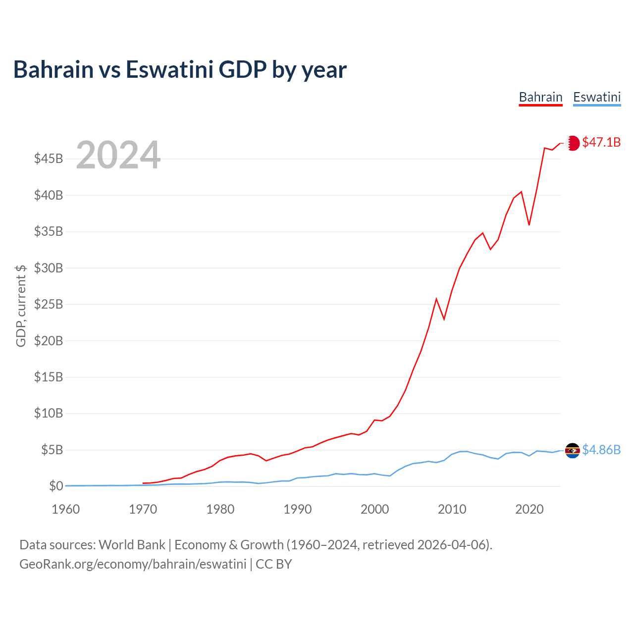 Bahrain has a GDP of $47.1B compared to $4.86B for Eswatini, ranking 96/197 and 162/197 by economy size, respectively.