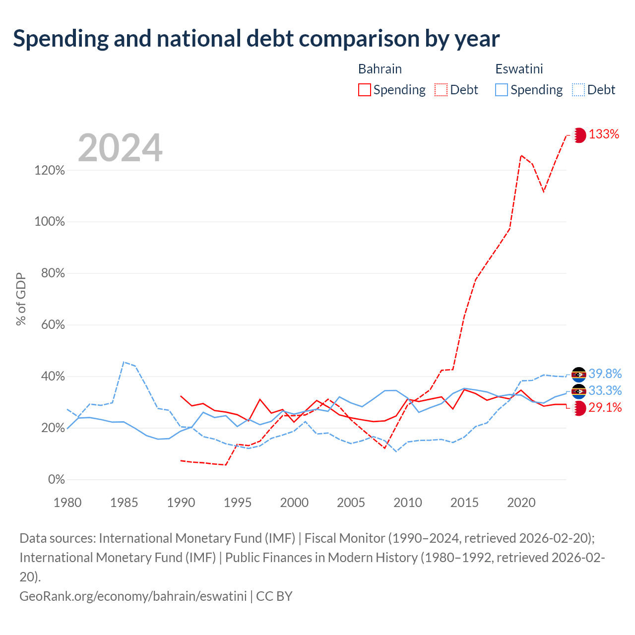 Bahrain has $62.8B in government debt (133.4% of GDP), compared to $1.93B (39.8% of GDP) in Eswatini.