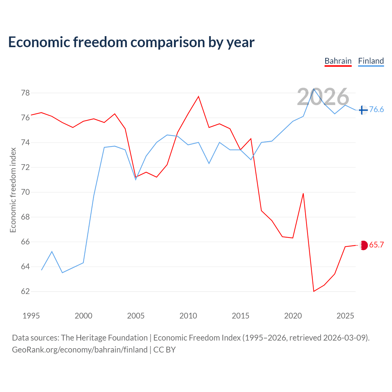 The Economic Freedom Index for Bahrain is 65.7, ranking 63/197, compared to 76.6 for Finland, ranking 15/197. The chart above displays a comparison of annual changes in economic freedom indexes.
