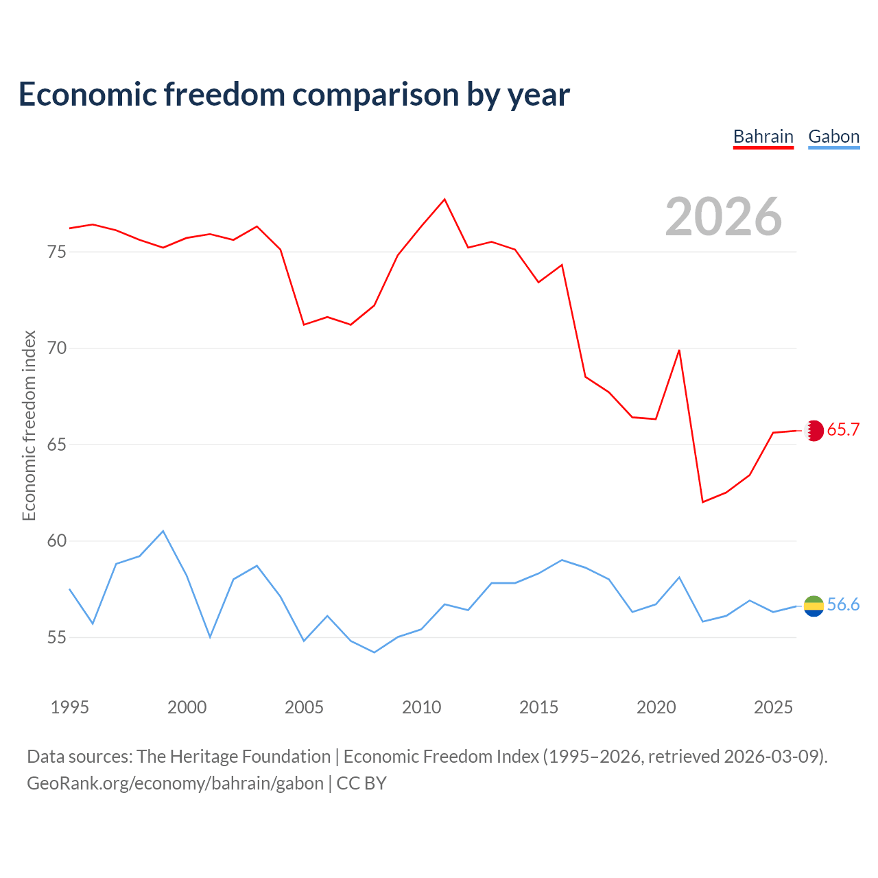 The Economic Freedom Index for Bahrain is 65.7, ranking 63/197, compared to 56.6 for Gabon, ranking 120/197. The chart above displays a comparison of annual changes in economic freedom indexes.
