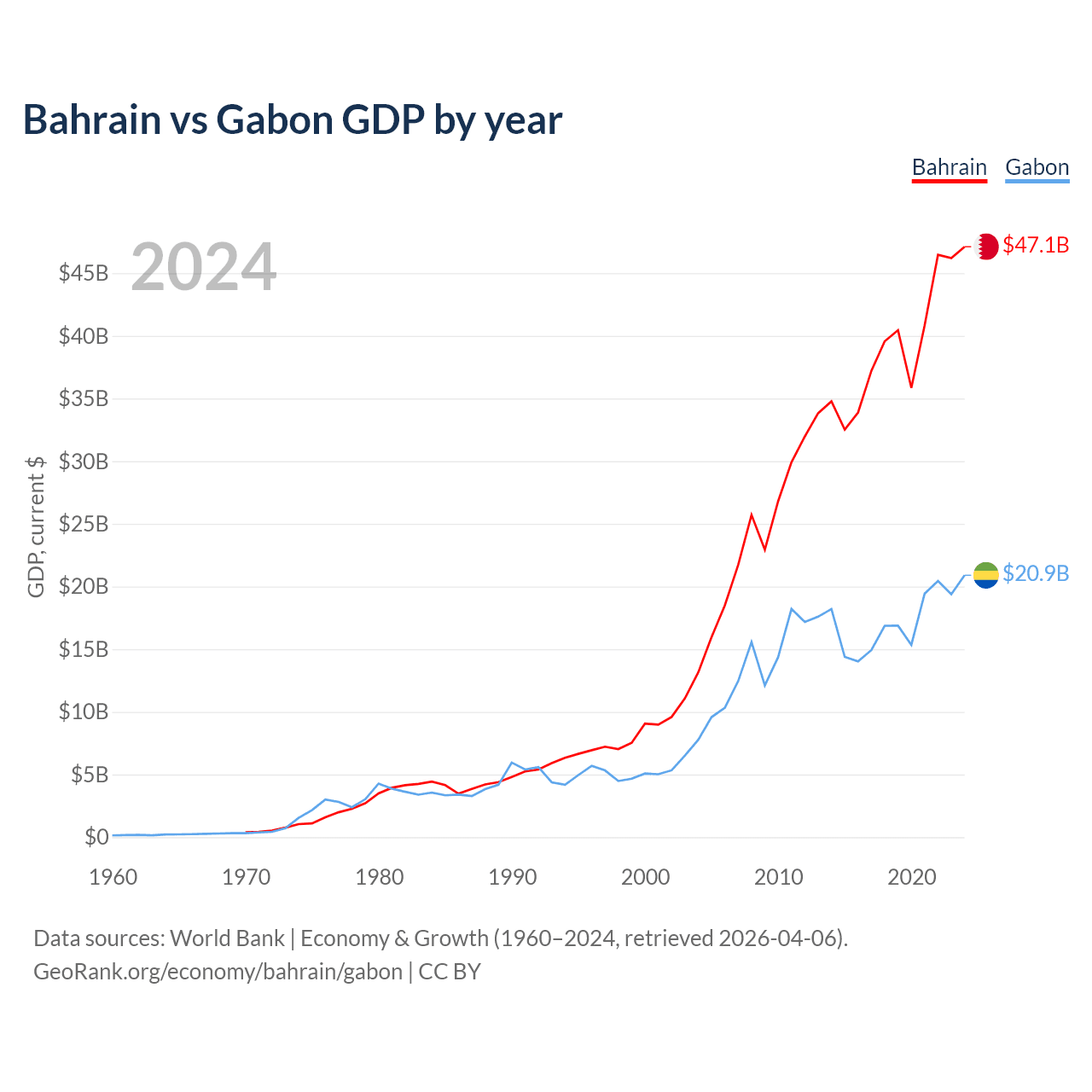Bahrain has a GDP of $47.1B compared to $20.9B for Gabon, ranking 96/197 and 127/197 by economy size, respectively.