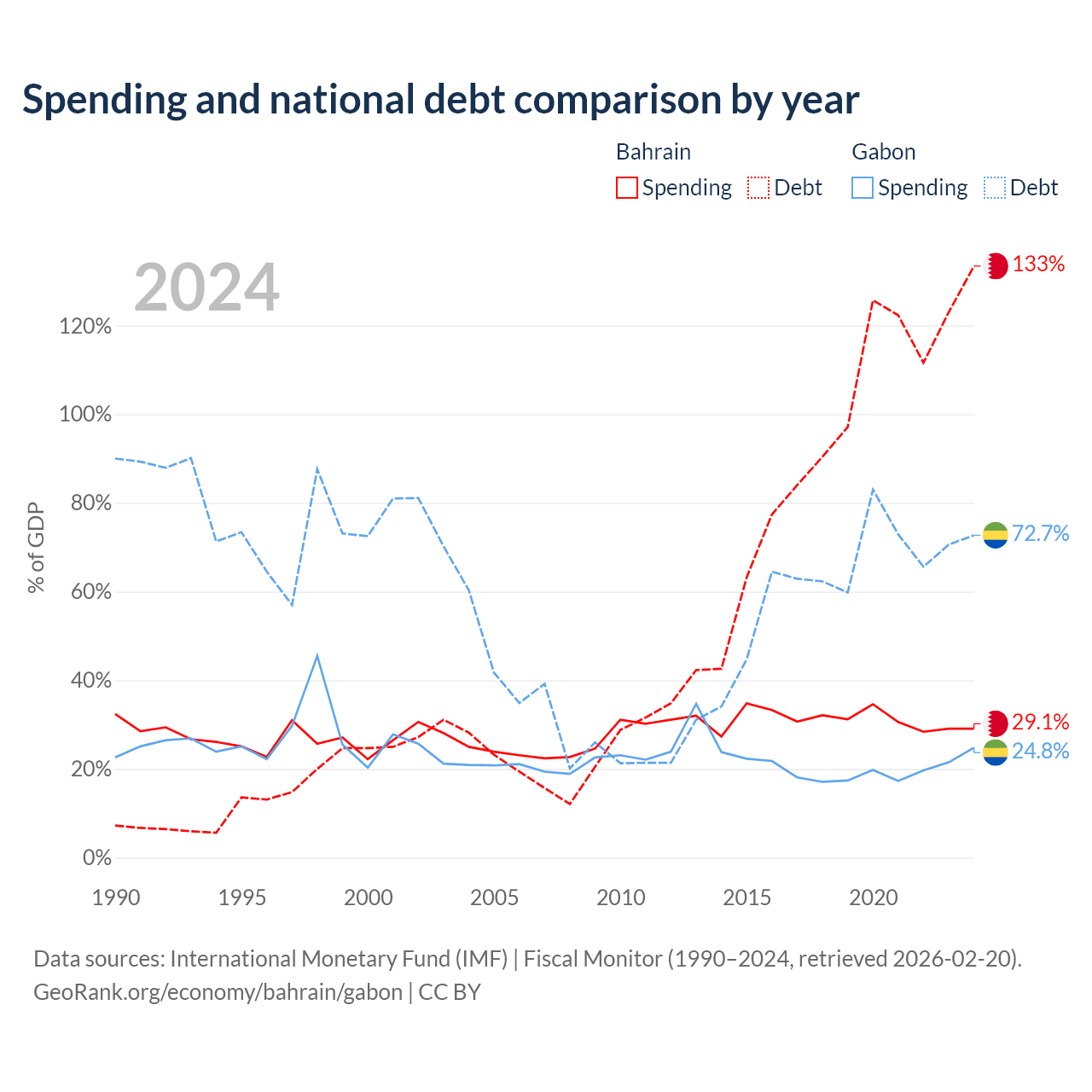 Bahrain has $62.8B in government debt (133.4% of GDP), compared to $15.2B (72.7% of GDP) in Gabon.