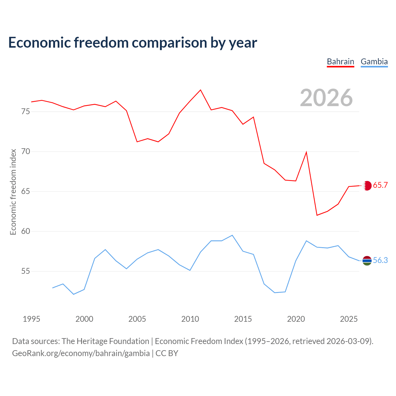 The Economic Freedom Index for Bahrain is 65.7, ranking 63/197, compared to 56.3 for the Gambia, ranking 123/197. The chart above displays a comparison of annual changes in economic freedom indexes.