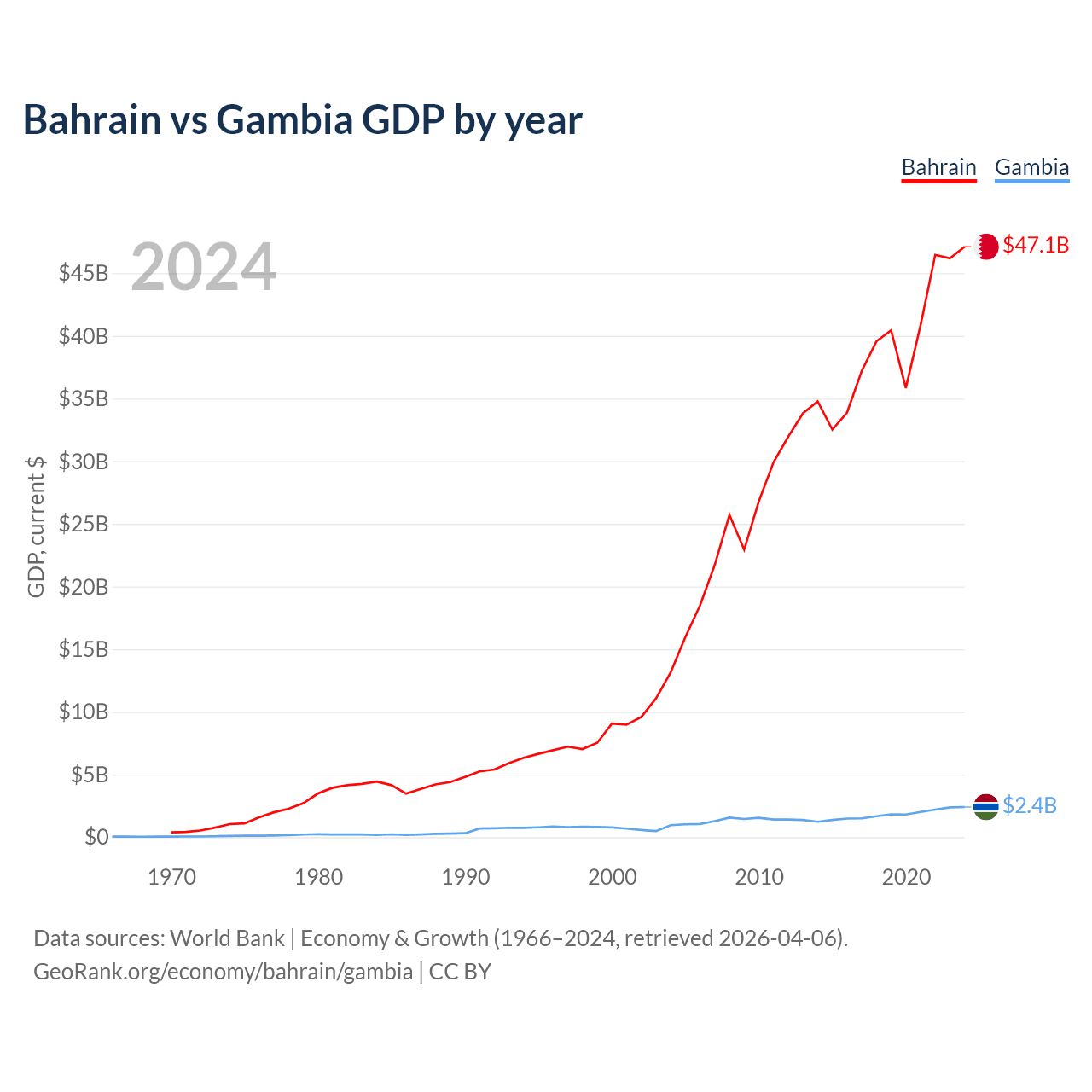 Bahrain has a GDP of $47.1B compared to $2.4B for the Gambia, ranking 96/197 and 174/197 by economy size, respectively.