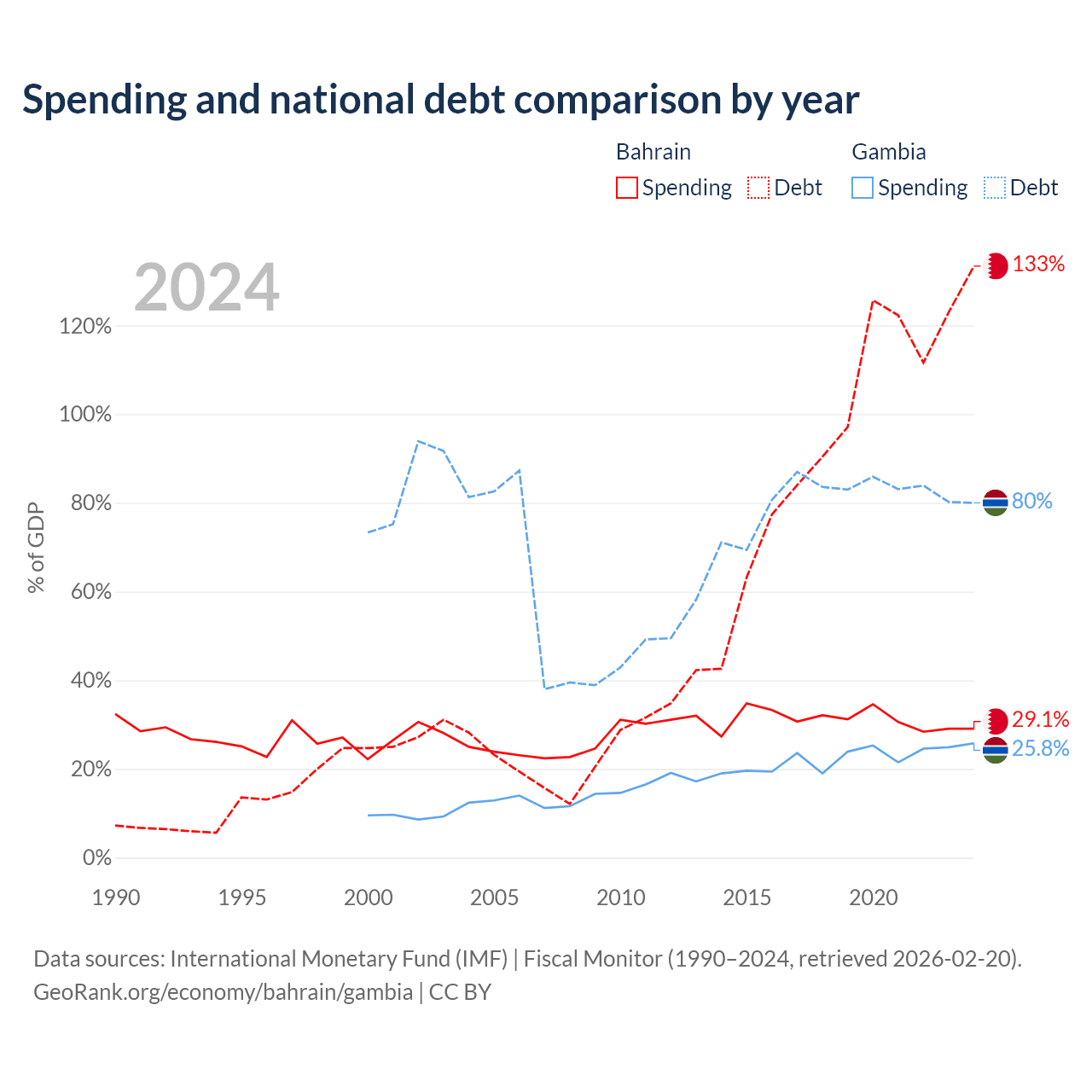 Bahrain has $62.8B in government debt (133.4% of GDP), compared to $1.92B (80% of GDP) in the Gambia.