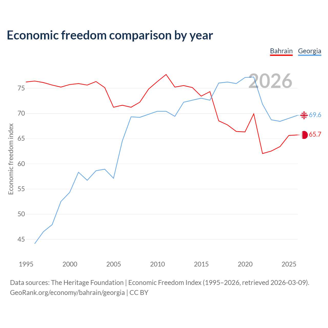 The Economic Freedom Index for Bahrain is 65.7, ranking 63/197, compared to 69.6 for Georgia, ranking 41/197. The chart above displays a comparison of annual changes in economic freedom indexes.