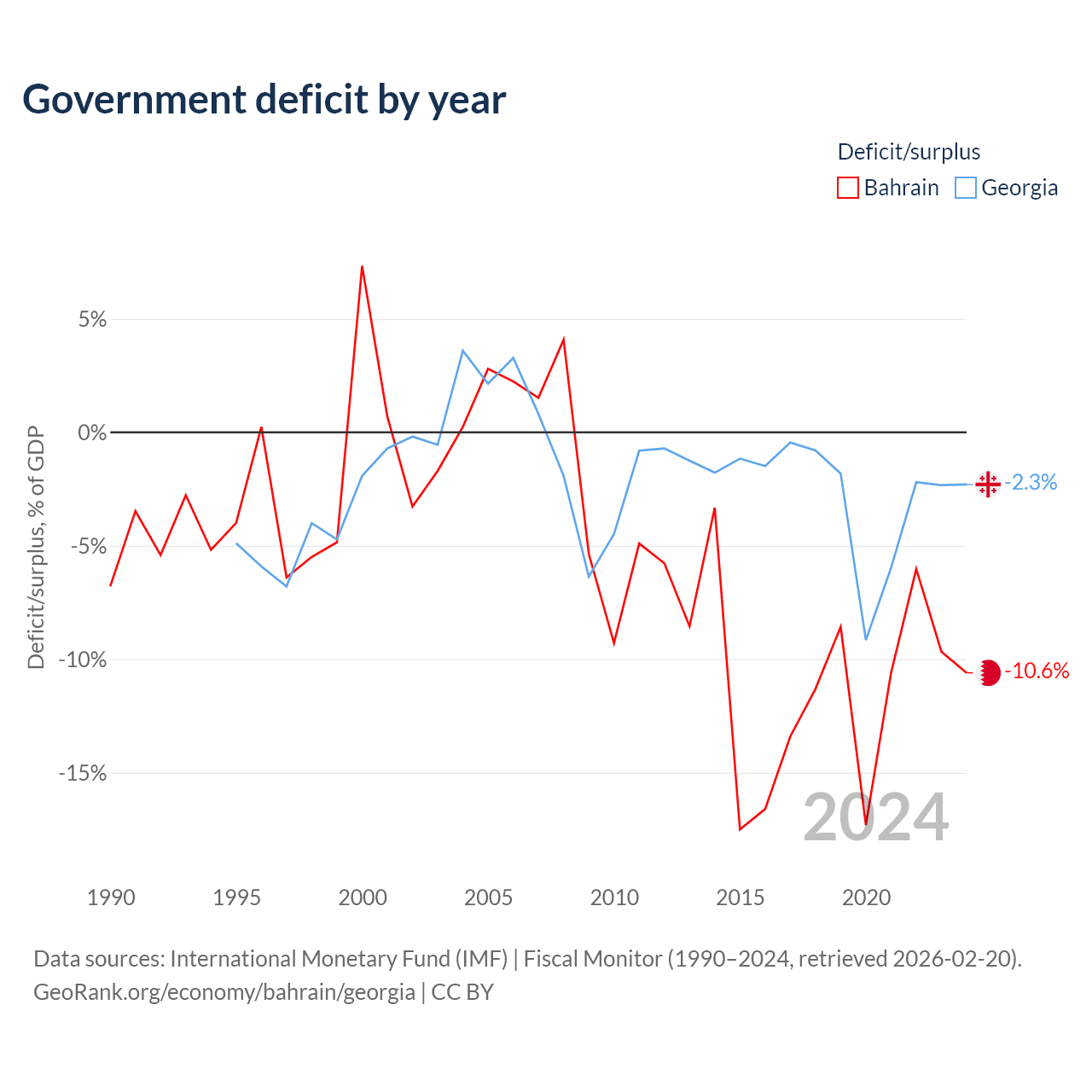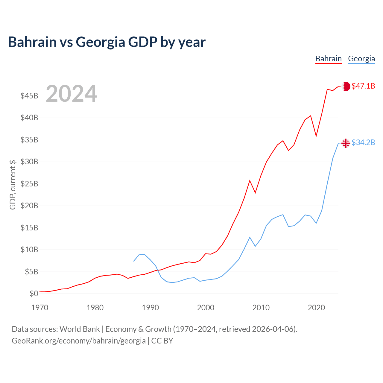 Bahrain has a GDP of $47.1B compared to $34.2B for Georgia, ranking 96/197 and 107/197 by economy size, respectively.
