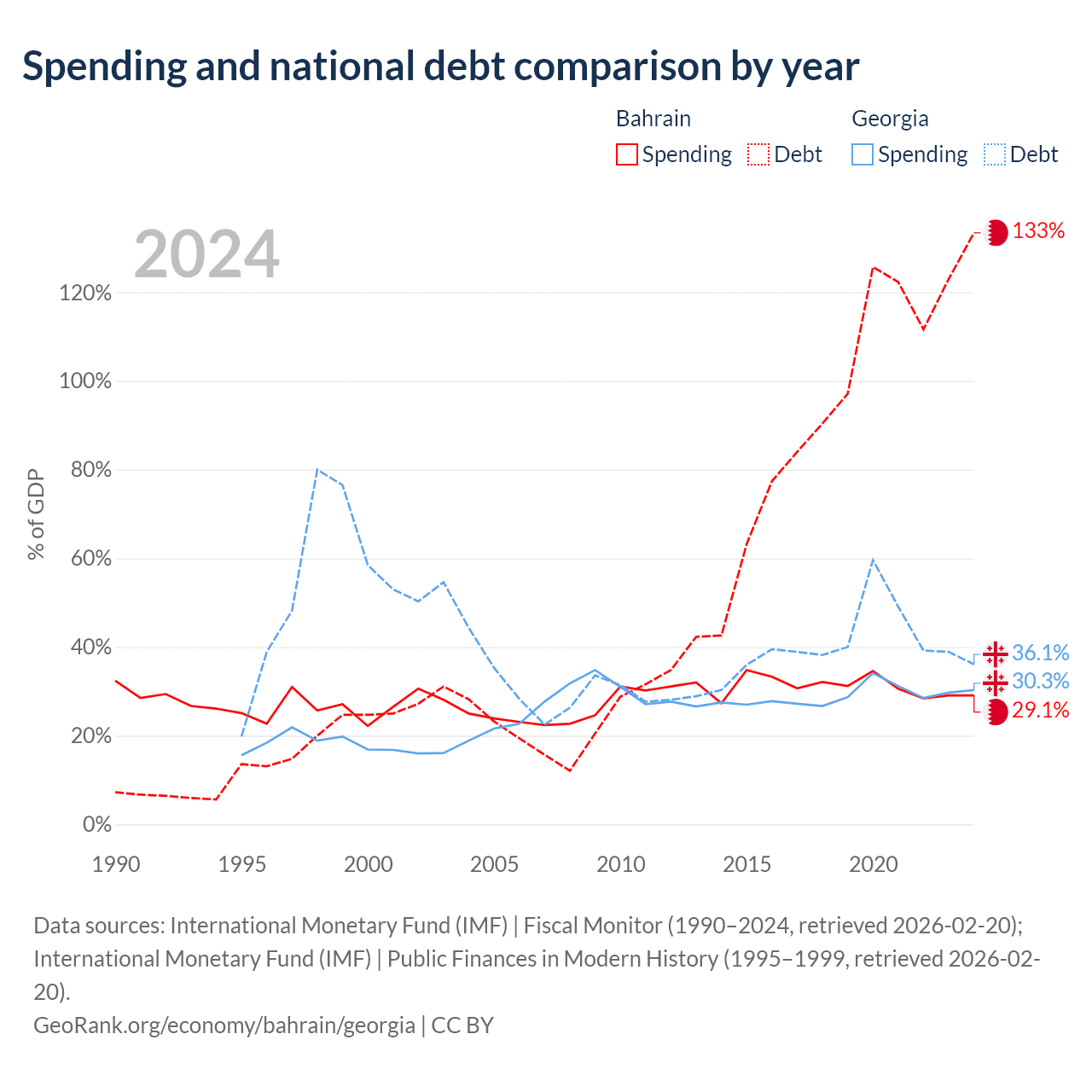 Bahrain has $62.8B in government debt (133.4% of GDP), compared to $12.3B (36.1% of GDP) in Georgia.