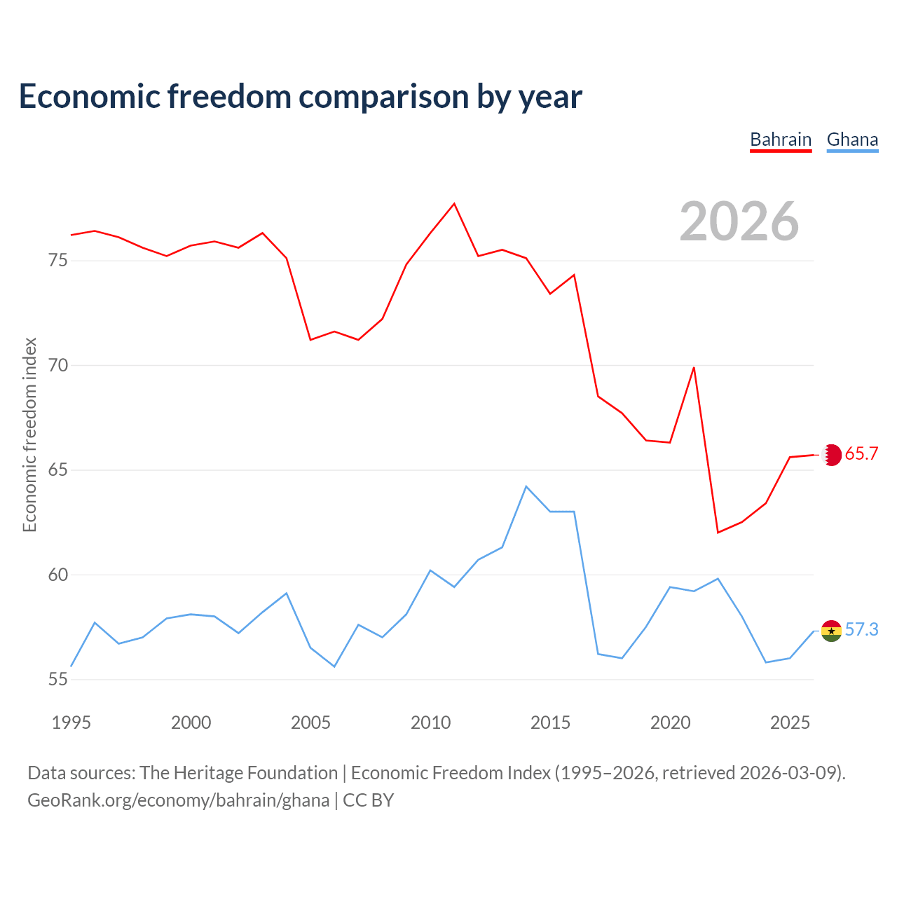 The Economic Freedom Index for Bahrain is 65.7, ranking 63/197, compared to 57.3 for Ghana, ranking 118/197. The chart above displays a comparison of annual changes in economic freedom indexes.