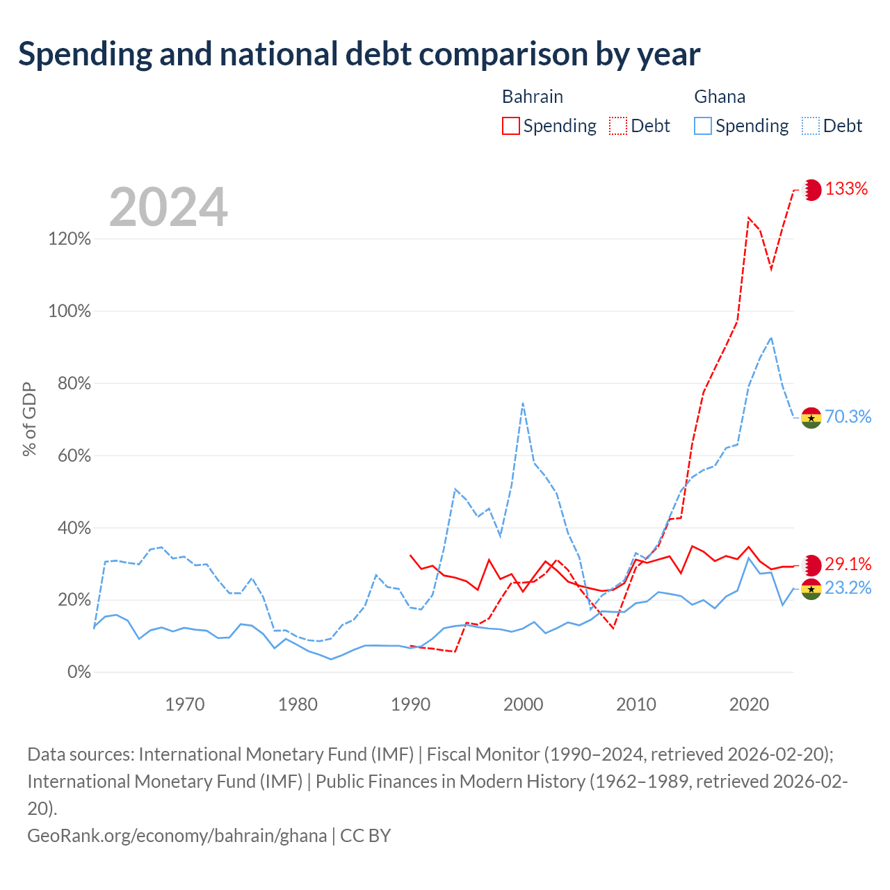 Bahrain has $62.8B in government debt (133.4% of GDP), compared to $57.9B (70.3% of GDP) in Ghana.