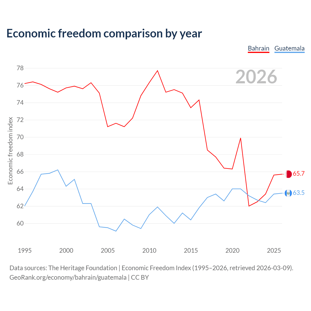 The Economic Freedom Index for Bahrain is 65.7, ranking 63/197, compared to 63.5 for Guatemala, ranking 79/197. The chart above displays a comparison of annual changes in economic freedom indexes.