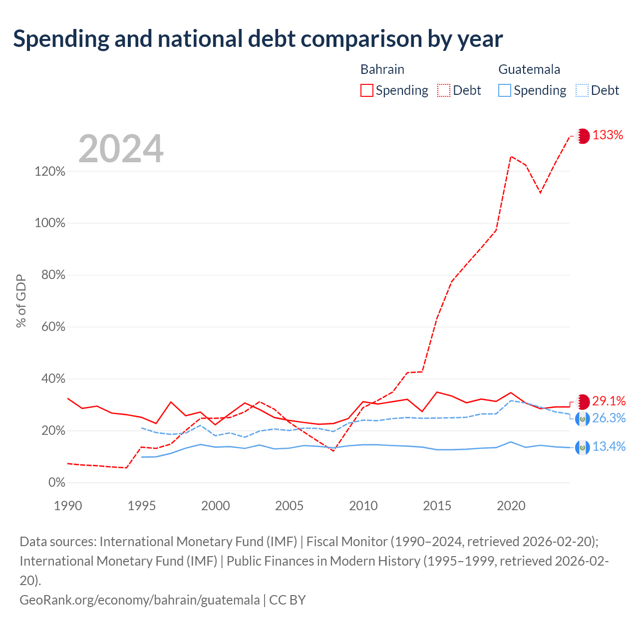 Bahrain has $62.8B in government debt (133.4% of GDP), compared to $29.8B (26.3% of GDP) in Guatemala.