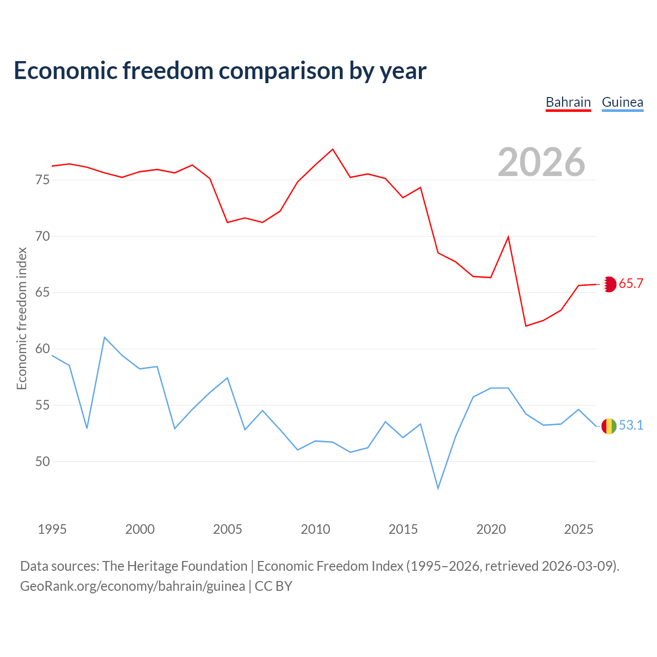 The Economic Freedom Index for Bahrain is 65.7, ranking 63/197, compared to 53.1 for Guinea, ranking 141/197. The chart above displays a comparison of annual changes in economic freedom indexes.