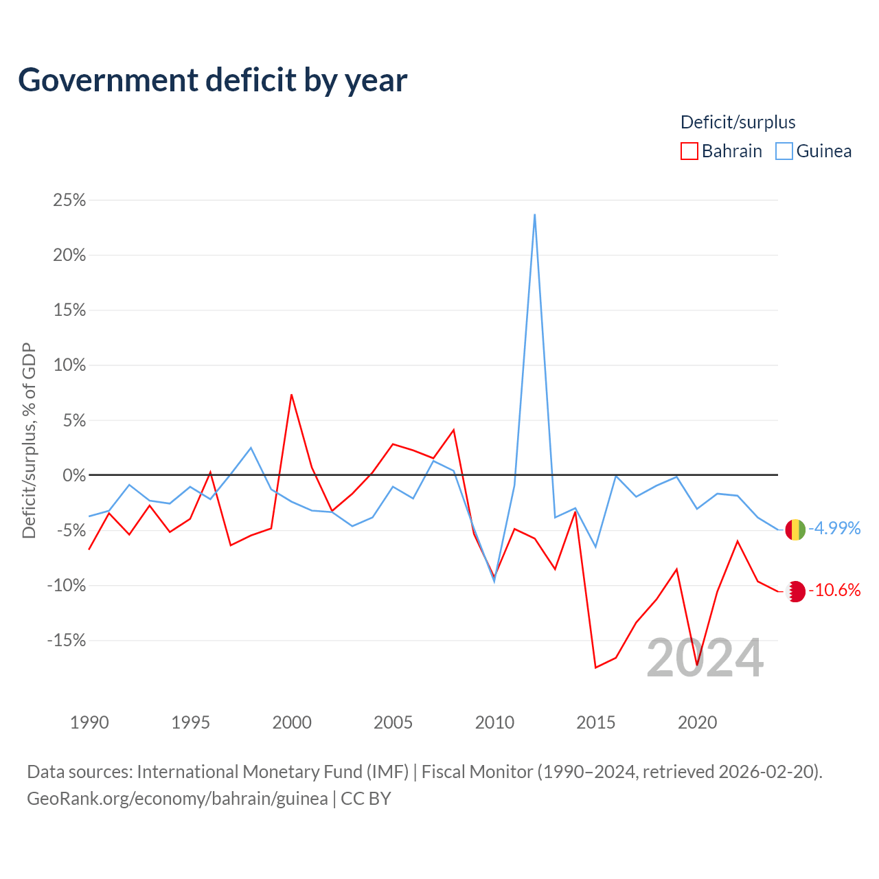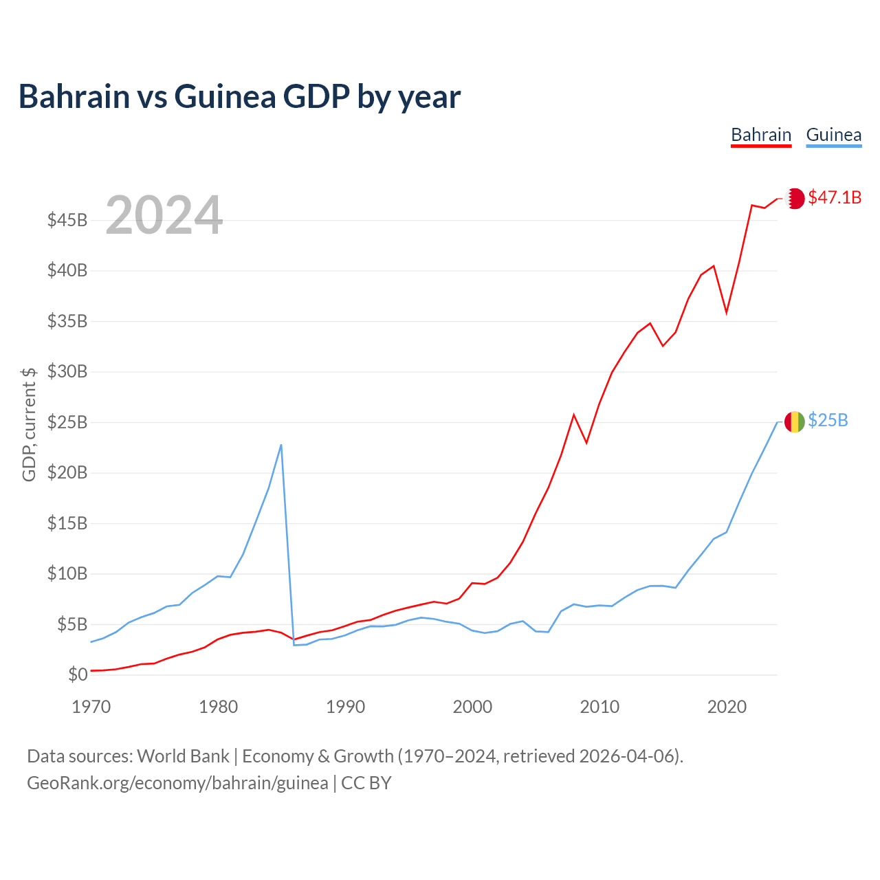 Bahrain has a GDP of $47.1B compared to $25B for Guinea, ranking 96/197 and 118/197 by economy size, respectively.