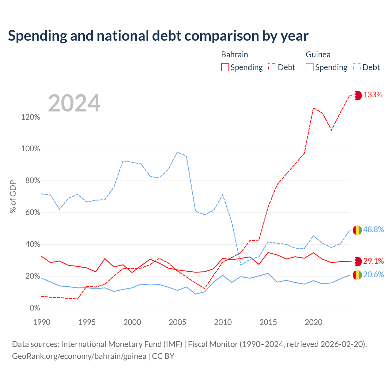 Bahrain has $62.8B in government debt (133.4% of GDP), compared to $12.2B (48.8% of GDP) in Guinea.