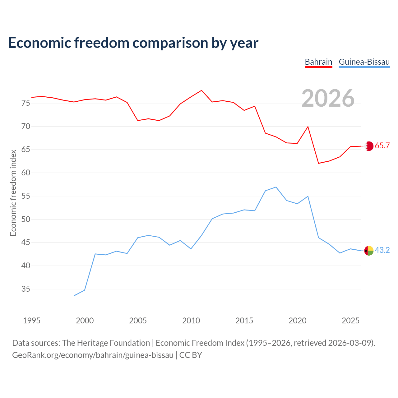 The Economic Freedom Index for Bahrain is 65.7, ranking 63/197, compared to 43.2 for Guinea-Bissau, ranking 181/197. The chart above displays a comparison of annual changes in economic freedom indexes.