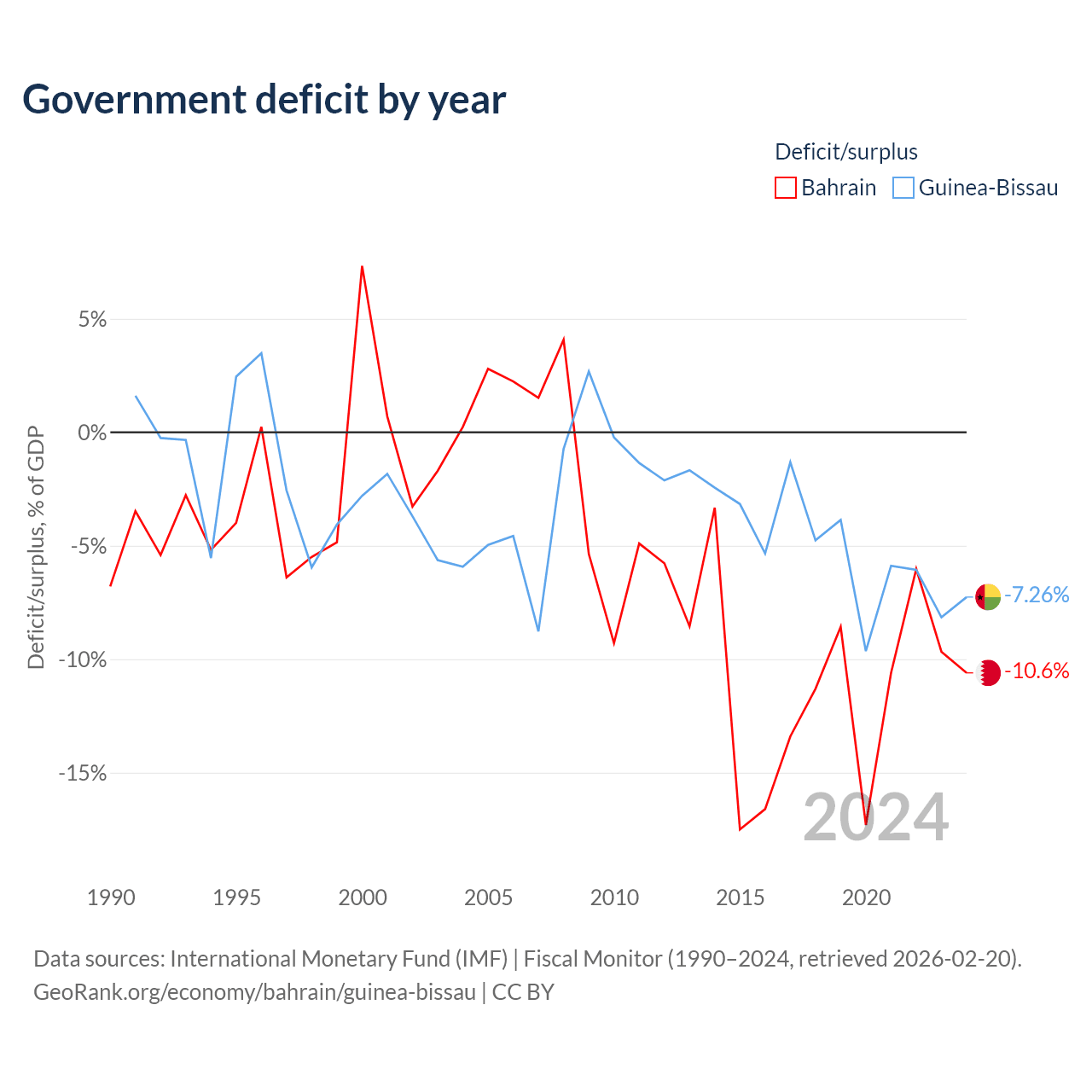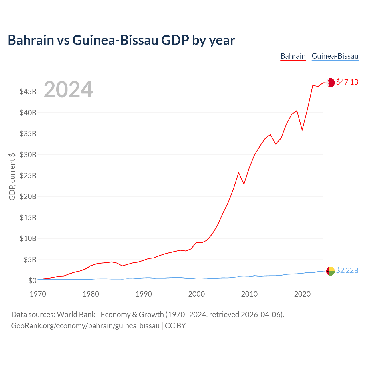 Bahrain has a GDP of $47.1B compared to $2.22B for Guinea-Bissau, ranking 96/197 and 176/197 by economy size, respectively.