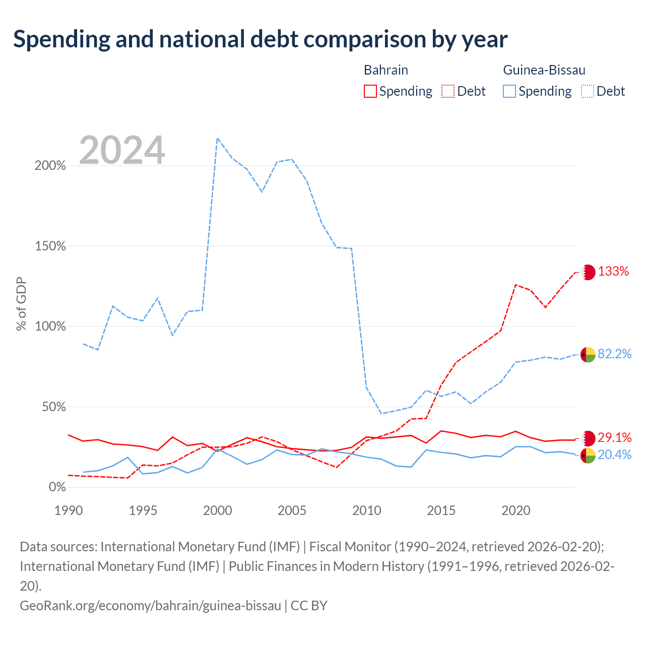 Bahrain has $62.8B in government debt (133.4% of GDP), compared to $1.82B (82.2% of GDP) in Guinea-Bissau.