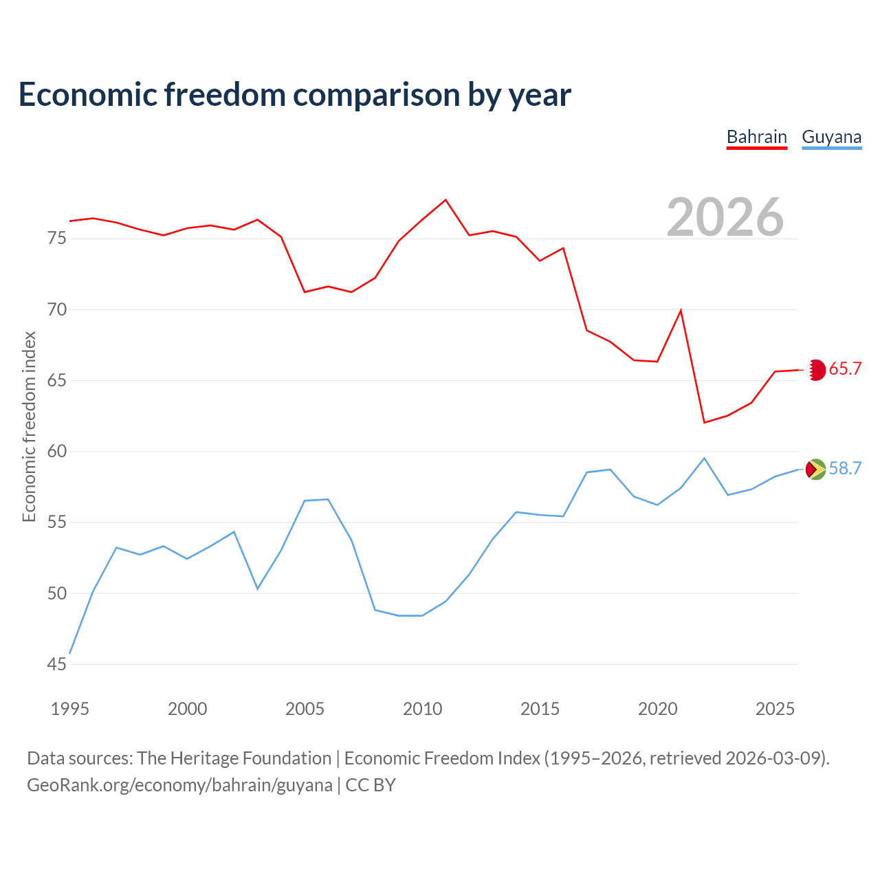 The Economic Freedom Index for Bahrain is 65.7, ranking 63/197, compared to 58.7 for Guyana, ranking 109/197. The chart above displays a comparison of annual changes in economic freedom indexes.