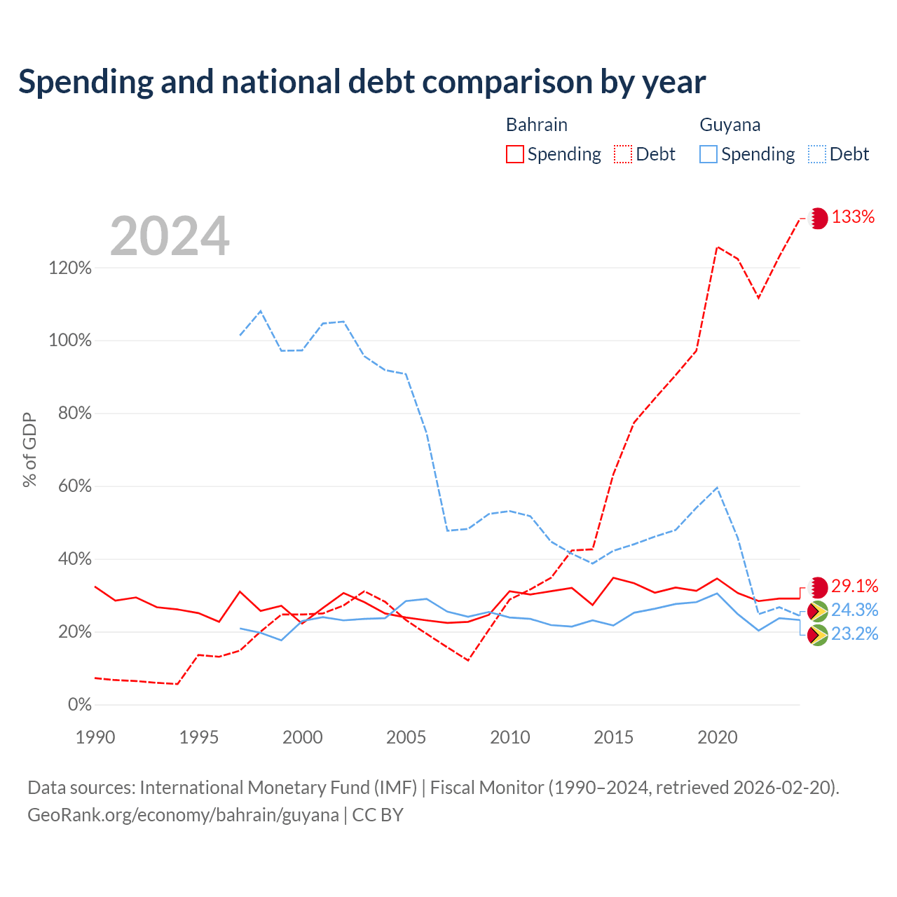Bahrain has $62.8B in government debt (133.4% of GDP), compared to $5.99B (24.3% of GDP) in Guyana.