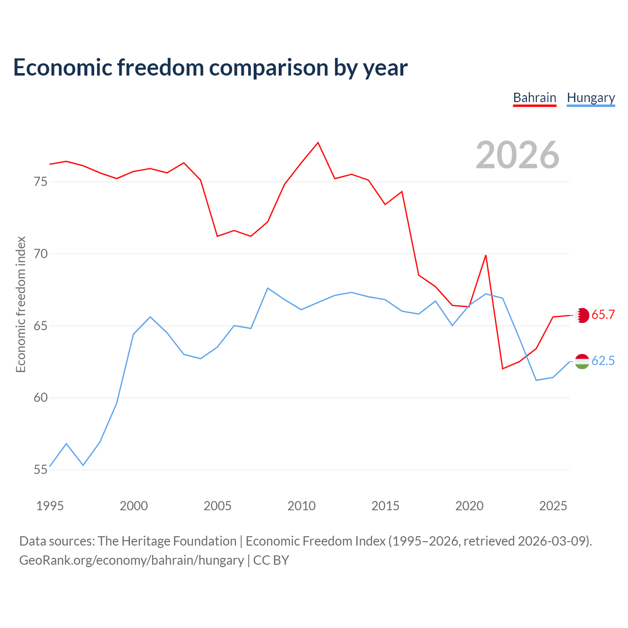 The Economic Freedom Index for Bahrain is 65.7, ranking 63/197, compared to 62.5 for Hungary, ranking 86/197. The chart above displays a comparison of annual changes in economic freedom indexes.