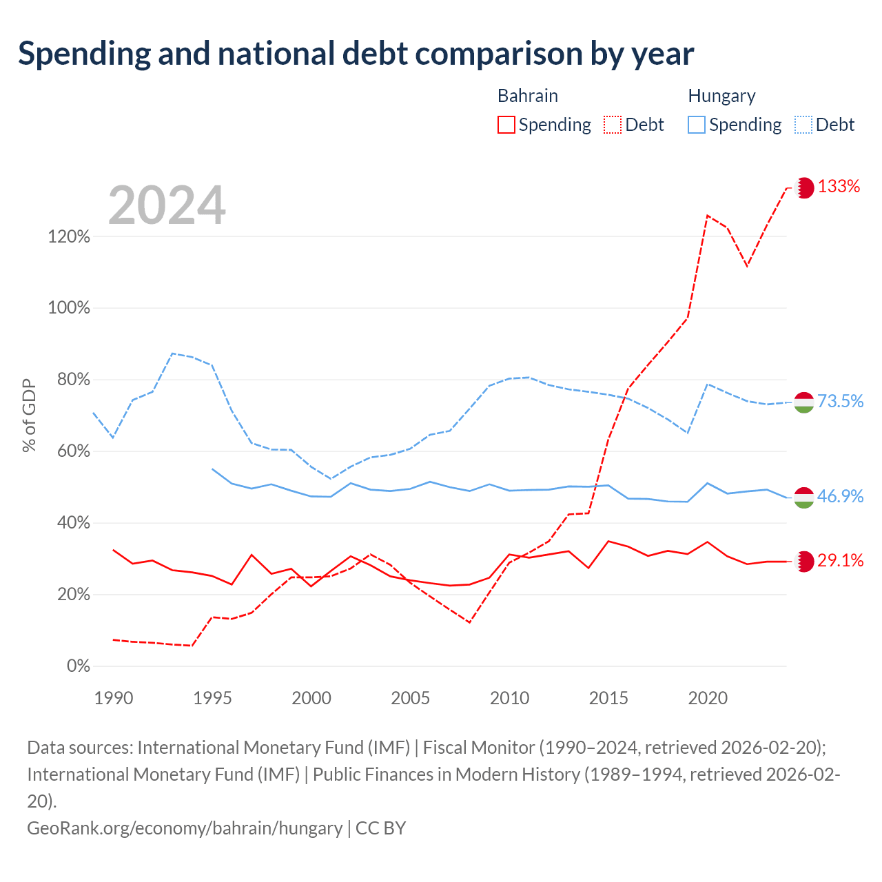 Bahrain has $62.8B in government debt (133.4% of GDP), compared to $164B (73.5% of GDP) in Hungary.