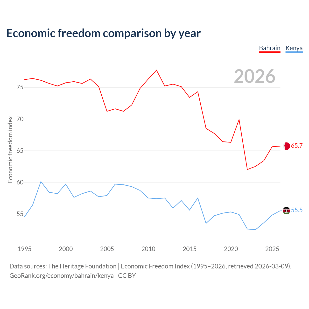 The Economic Freedom Index for Bahrain is 65.7, ranking 63/197, compared to 55.5 for Kenya, ranking 128/197. The chart above displays a comparison of annual changes in economic freedom indexes.